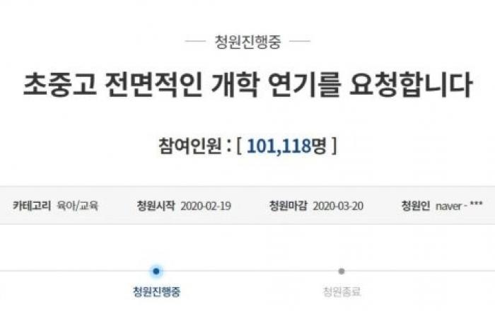 신종 코로나바이러스 감염증(코로나19)이 전국으로 확산되는 가운데 오는 3월 2일 예정인 전국 초·중·고등학교 개학을 연기해달라는 국민청원이 10만명을 넘어섰다. 청와대 국민청원 게시판에 따르면 지난 19일 올라온 ‘초중고교 전면적인 개학 연기를 요청합니다’라는 청원에