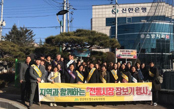 경상북도영주교육지원청(교육장 김점섭)은 설 명절을 앞두고 전통시장인 중앙시장과 인근 재래시장을 찾아 설 명절 맞이 전통시장 장보기 행사를 가졌다.설맞이 장보기 행사는 경기침체와 고객감소 등 어려움을 겪고 있는 전통시장의 이용 참여를 유도하고 활력을 불어넣기 위해 마련