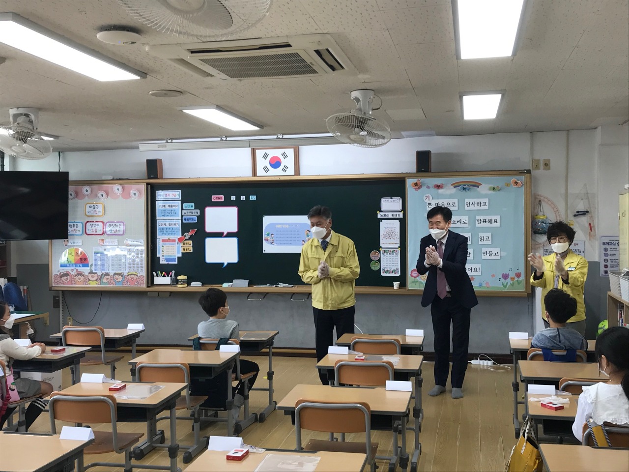 문경교육지원청(교육장 김덕희)은 경북형 등교수업 계획에 맞추어 2020년 5월 27일 중3, 초1·2학년 등교개학이 이루어지고 있는 문경여중과 모전초등학교를 방문하여 안전한 등교수업을 위해 학교현장을 지원하였다.