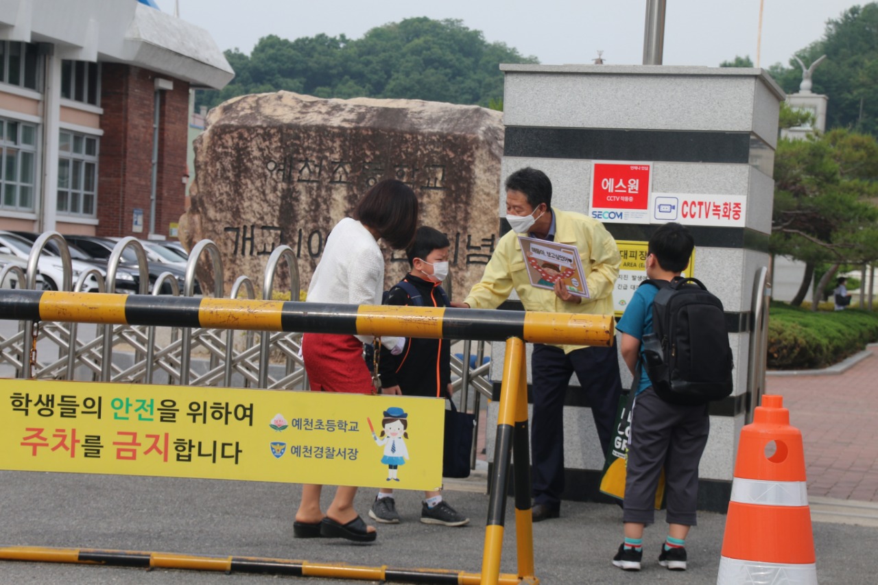 3일 오전8시 예천초등학교(교장 권명숙) 정문에서 올해 첫 등교를 하는 초등3,4학년을 이승진 예천교육장은 ‘얘들아,보고싶었어!!’라고 적힌 피켓을 들고 “얘들아 안녕, 우리 거리두기 해야지.”“건강하게 열심히 하자”라며 환한 웃음로 반갑게 맞이했다.