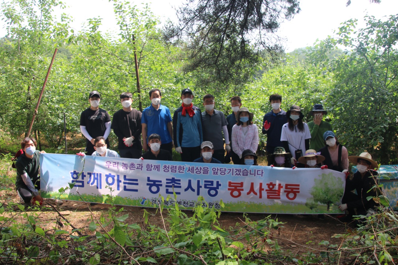 [채석일 기자]예천교육지원청(교육장 이승진) 행정지원과 전 직원은 4일 코로나19 장기화로 일손이 부족해 어려움을 겪고 있는 예천 감천면 과수농가(한천사길 조원호씨 농장)를 찾아 도움의 손길을 보탰다.