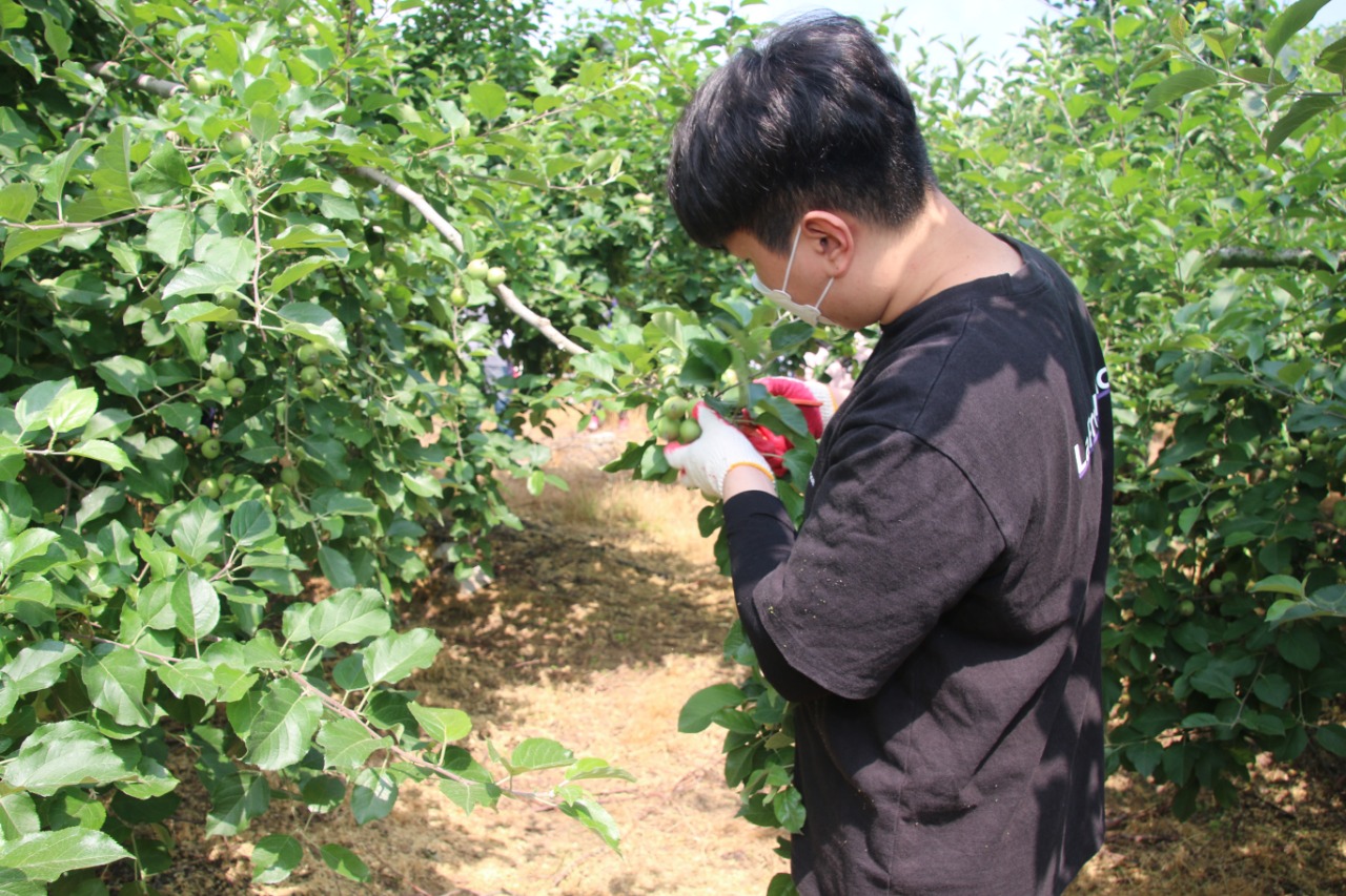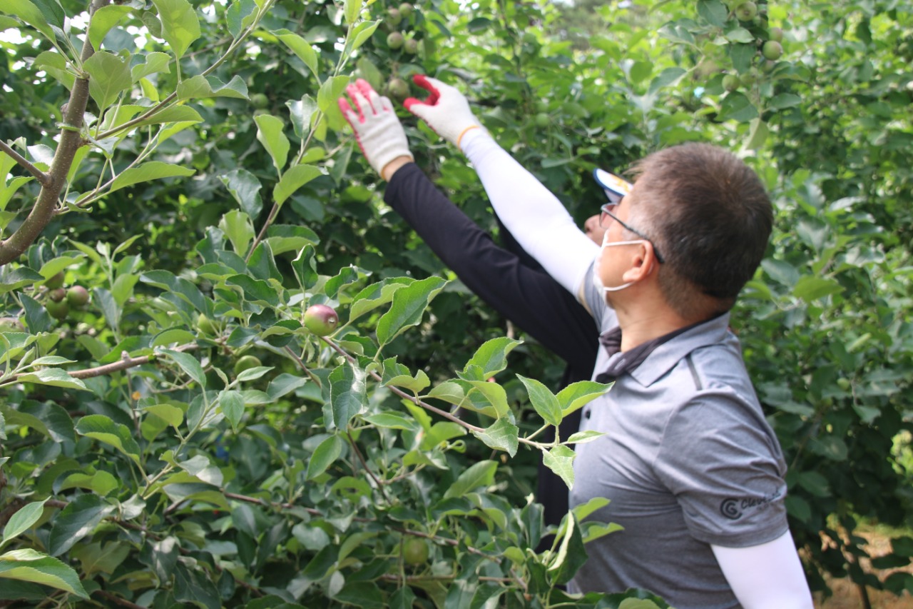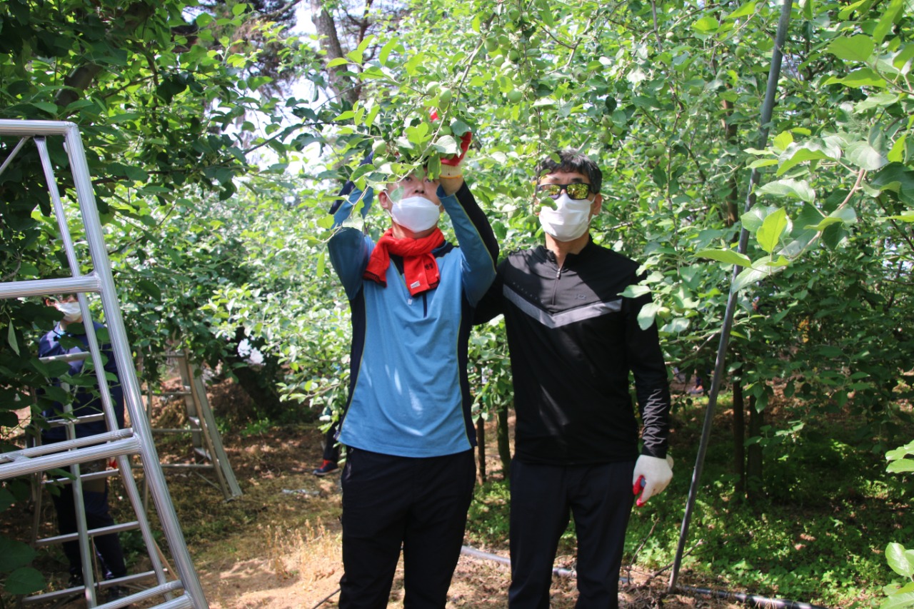 생활 속 거리두기 기간 중 추진된 이번 봉사활동은 열매 솎아주기 작업에 대한 사전교육과 함께, 마스크 착용·손 소독·작업자 간 안전거리 유지 등 코로나19 방역 안전수칙을 지키는 가운데 진행됐다.