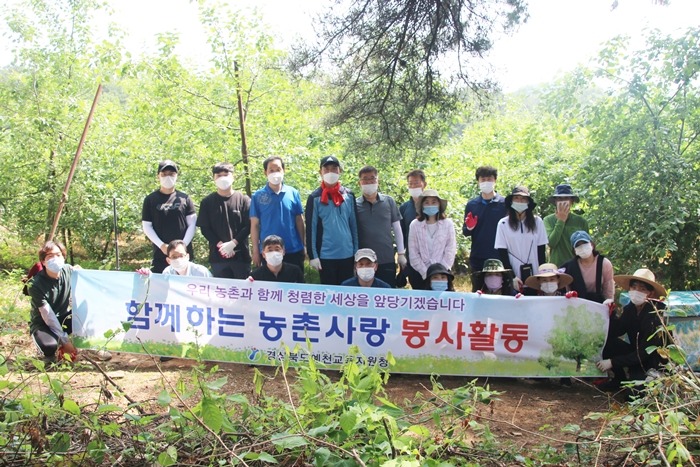 이번 농촌사랑 봉사활동에 참여한 예천교육지원청 직원들은 감천면 소재 조원호씨사과농장에서 구슬땀을 흘리며 사과나무 열매 솎아주기(적과작업)를 도왔다.