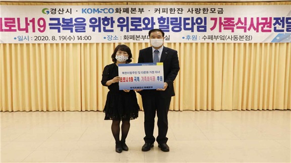 【경산=권성옥 기자】경산지역 민간 사회봉사단체인 커피 한잔 사랑 한 모금(회장 민향심)과 한국조폐공사 화폐본부(본부장 권칠인)는 경산시 거주 북한 이탈주민, 다문화 가족, 가정위탁아동 가정에 가족이 오붓하게 식사할 수 있는 4만원 상당의 가족식사권 100장 전달 행사를 19일 화폐본부 사무실에서 개최했다.