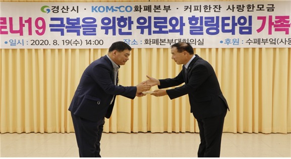 “2020, 코로나19 극복 힐링 타임”을 슬로건으로 진행된 이번 행사는 2019년 6월 21일 경산시와 한국조폐공사 화폐본부, 커피 한잔 사랑 한 모금이 북한 이탈주민과 다문화 가정청소년들의 연 2회 정서지원 활동을 위해 협약을 체결한 후 세 번째 활동이며, 경산시 건강가정·다문화가족 지원센터, 새싹회, 가정 위탁 세 곳의 대표들이 참석하여 식사 상품권 수령 후 대상자에게 직접 배부하기로 했다.