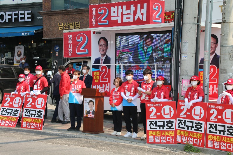 [채석일 기자]19일 오후3시 6.1지방선거 영주시의회의원 전규호 후보(국민의 힘.마선거구)가 이번 지방선거 국민의 힘 공천을 받은 후보들과 300여명의 지지자들이 참석한 가운데 당선 출발을 알리는 출정식을 열었다.