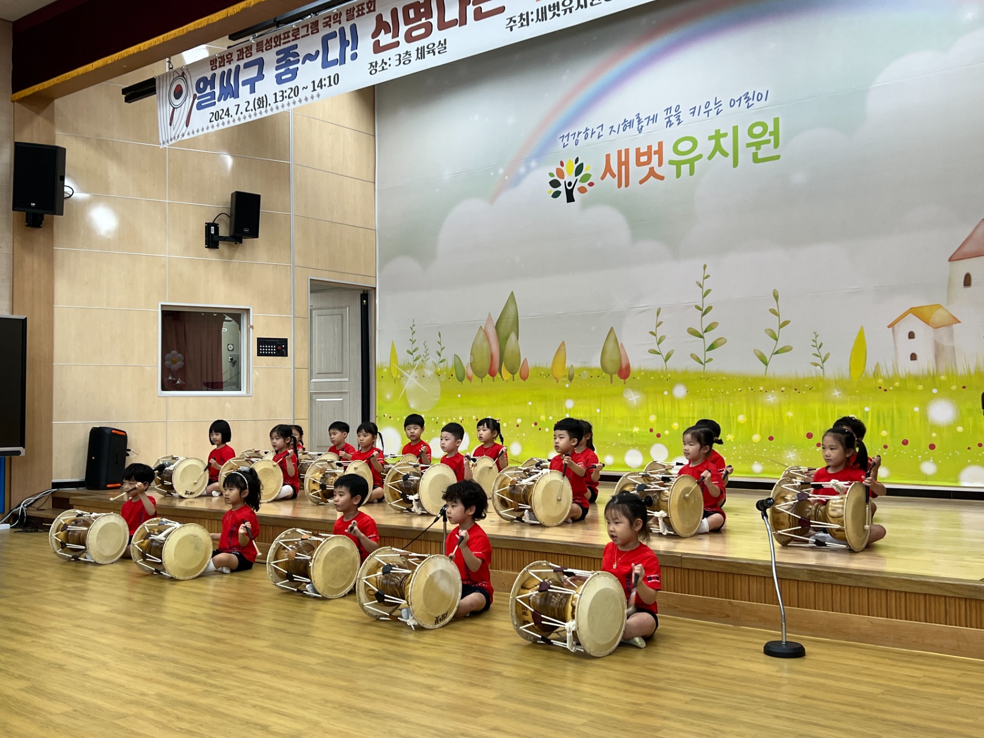 새벗유치원(원장 우수경)은 7월 2일(화) 3층 체육실에서 유아 121명을 대상으로 국악 발표회를 실시하였다.