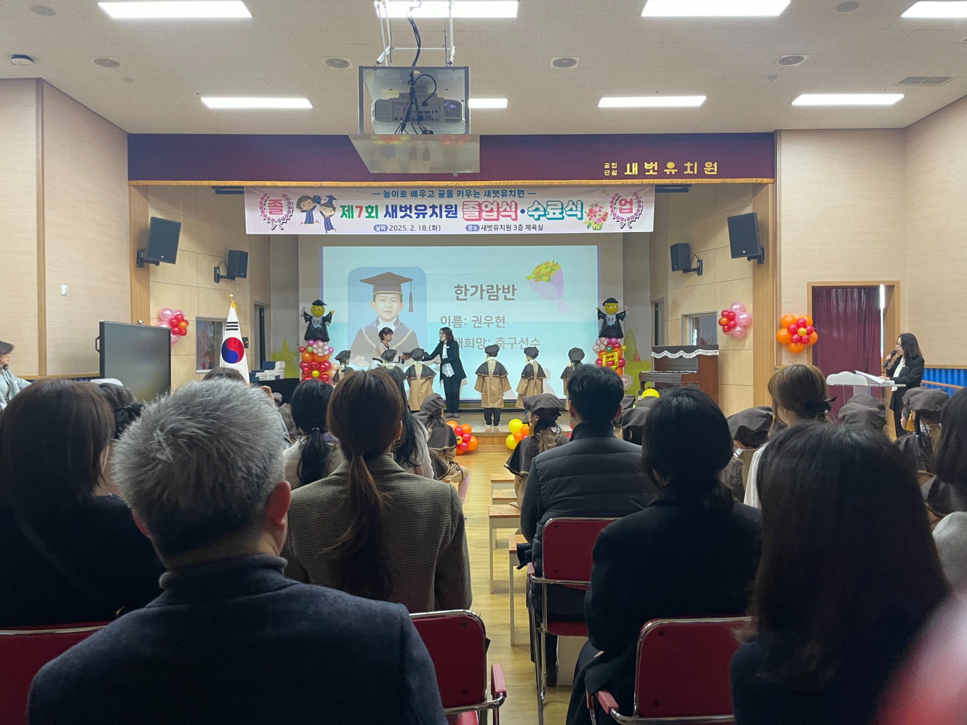 새벗유치원(원장 우수경)은 2025년 2월 18일(화) 3층 체육실에서 졸업생 43명과 수료생 74명을 대상으로 제7회 졸업식 및 수료식을 진행했다.