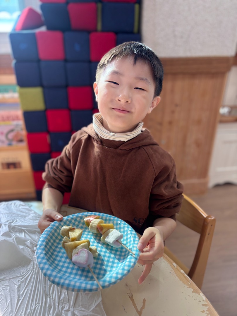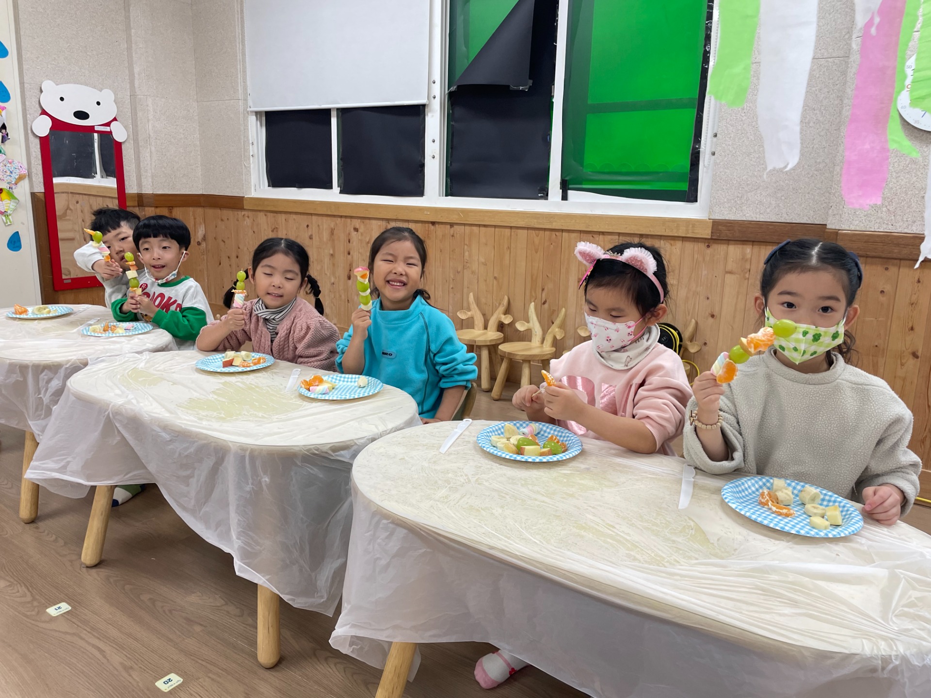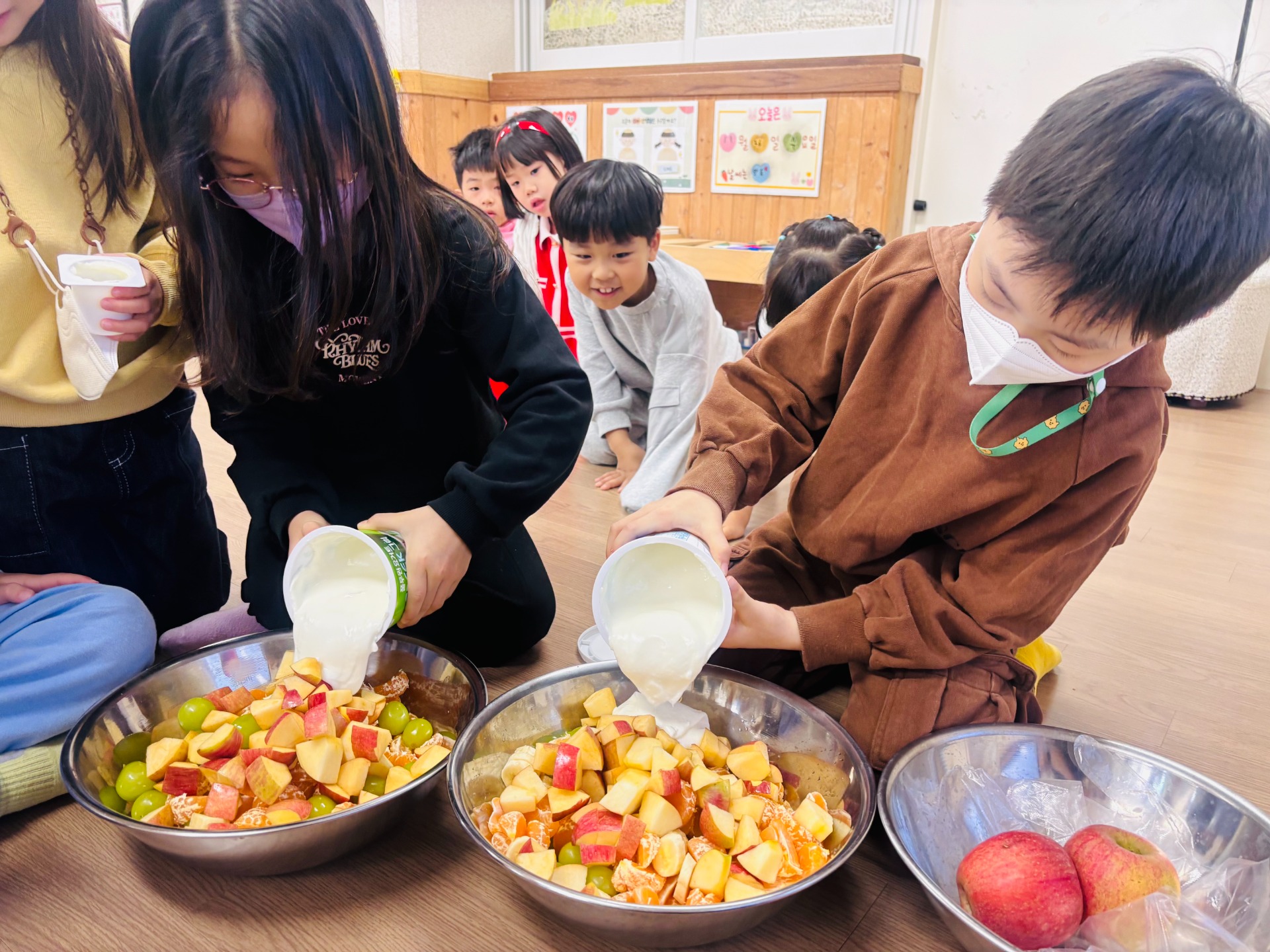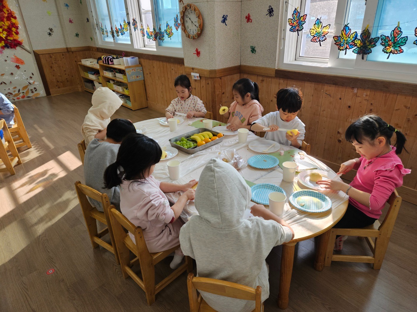 사과 놀이 day가 끝나고 3세 000은 “동글동글 사과에 이쑤시개를 꽂아서 고슴도치를 만들었어요.”라고 말했고, 5세 000은 “사과 샐러드가 엄청 맛있어요! 요거트로 만드니까 달콤해서 더 맛있는 것 같아요.”라며 소감을 밝혔다.