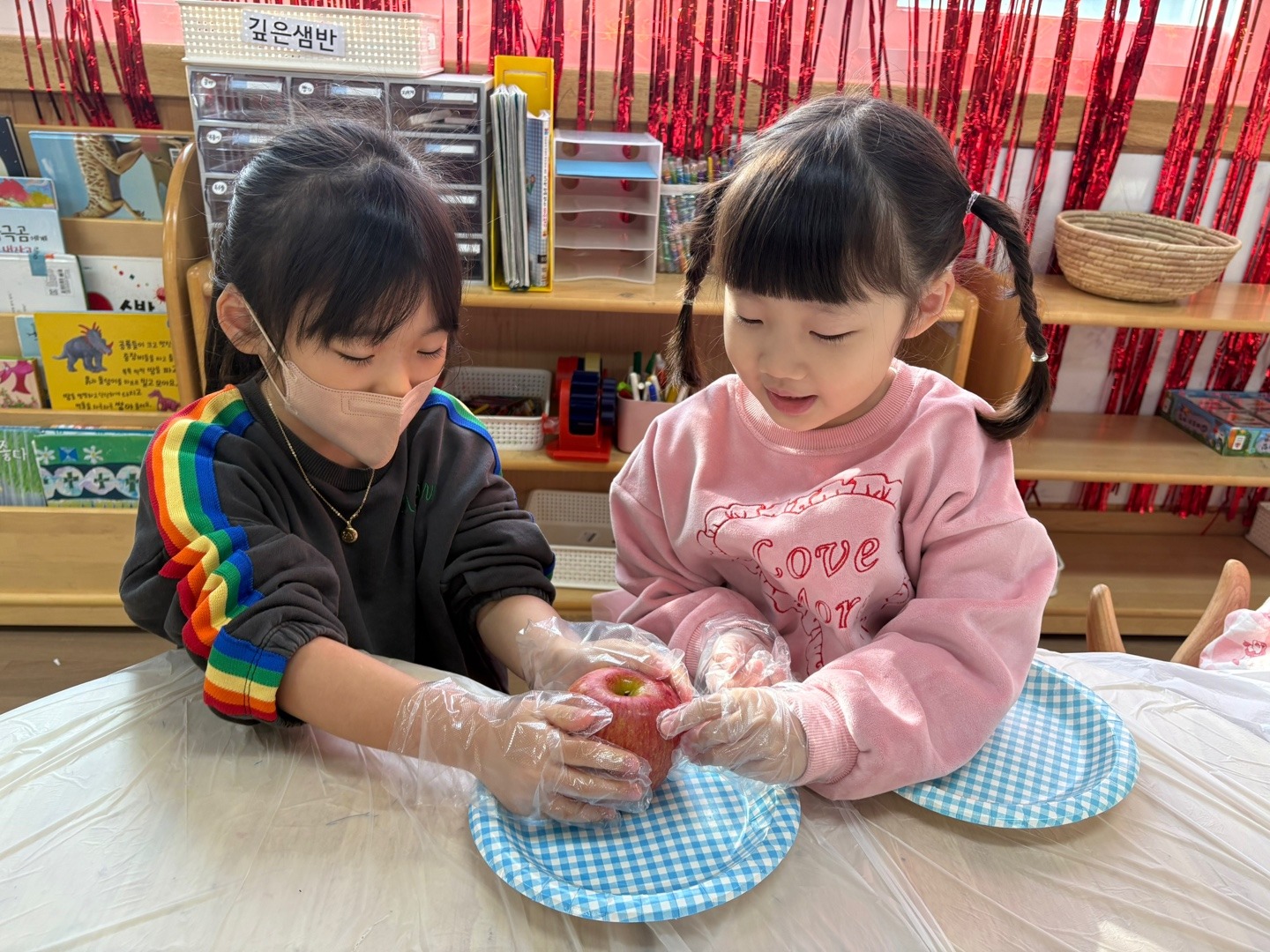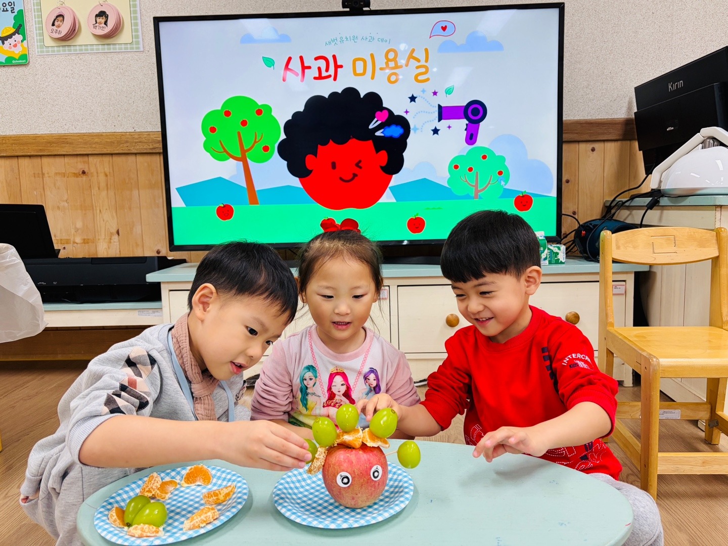 새벗유치원(원장 우수경)은 11월 27일(목) 유아 122명을 대상으로 각 학급에서 유아들의 사과를 활용해 놀이하는 ‘사과 놀이day’를 실시했다.