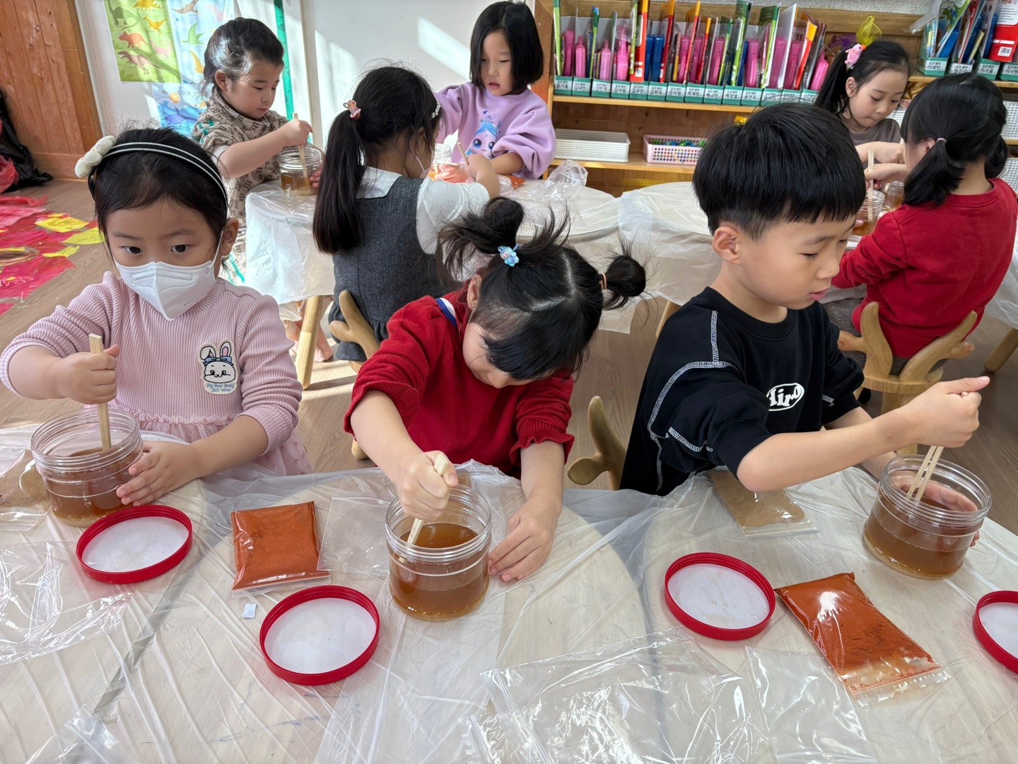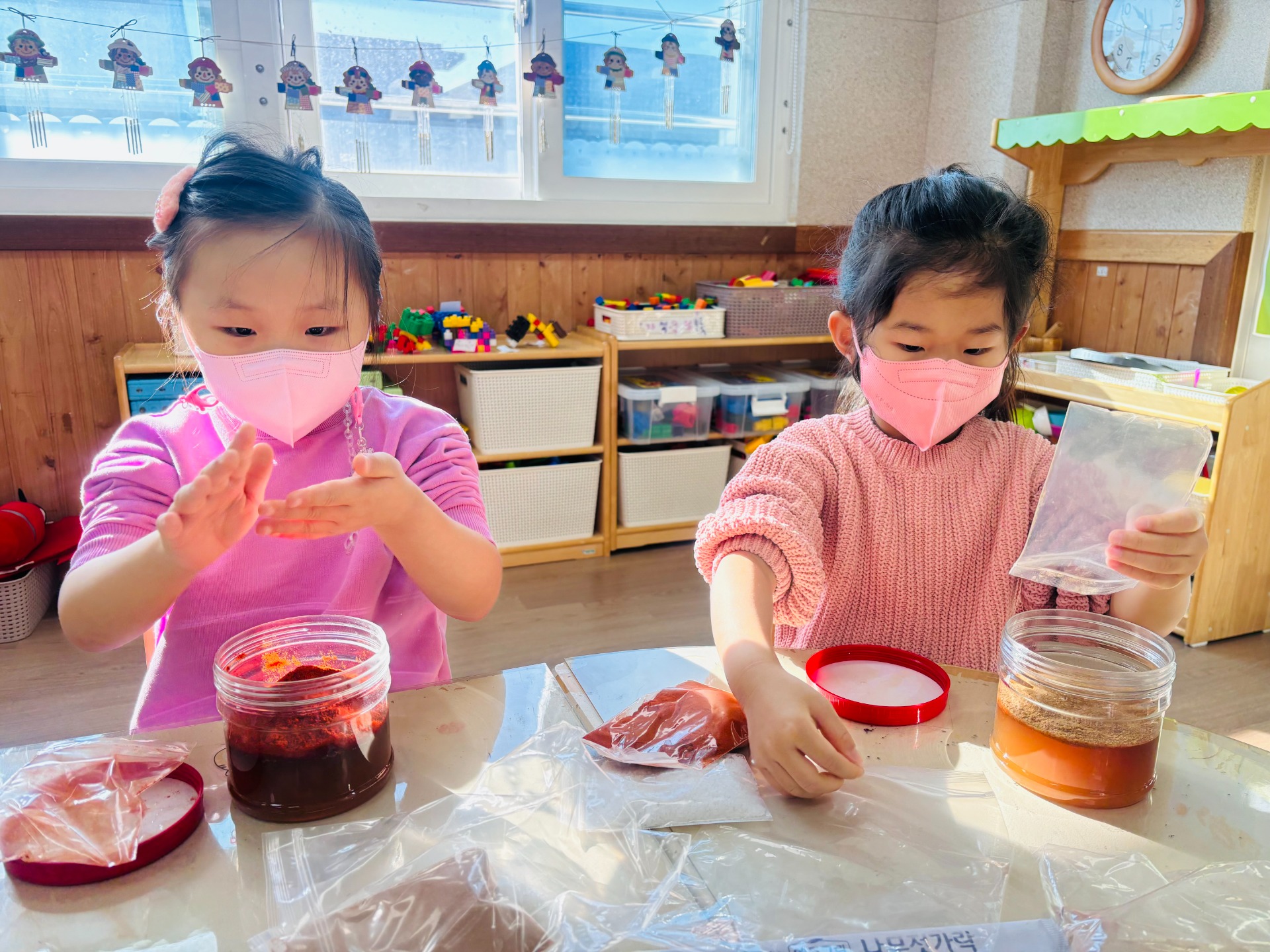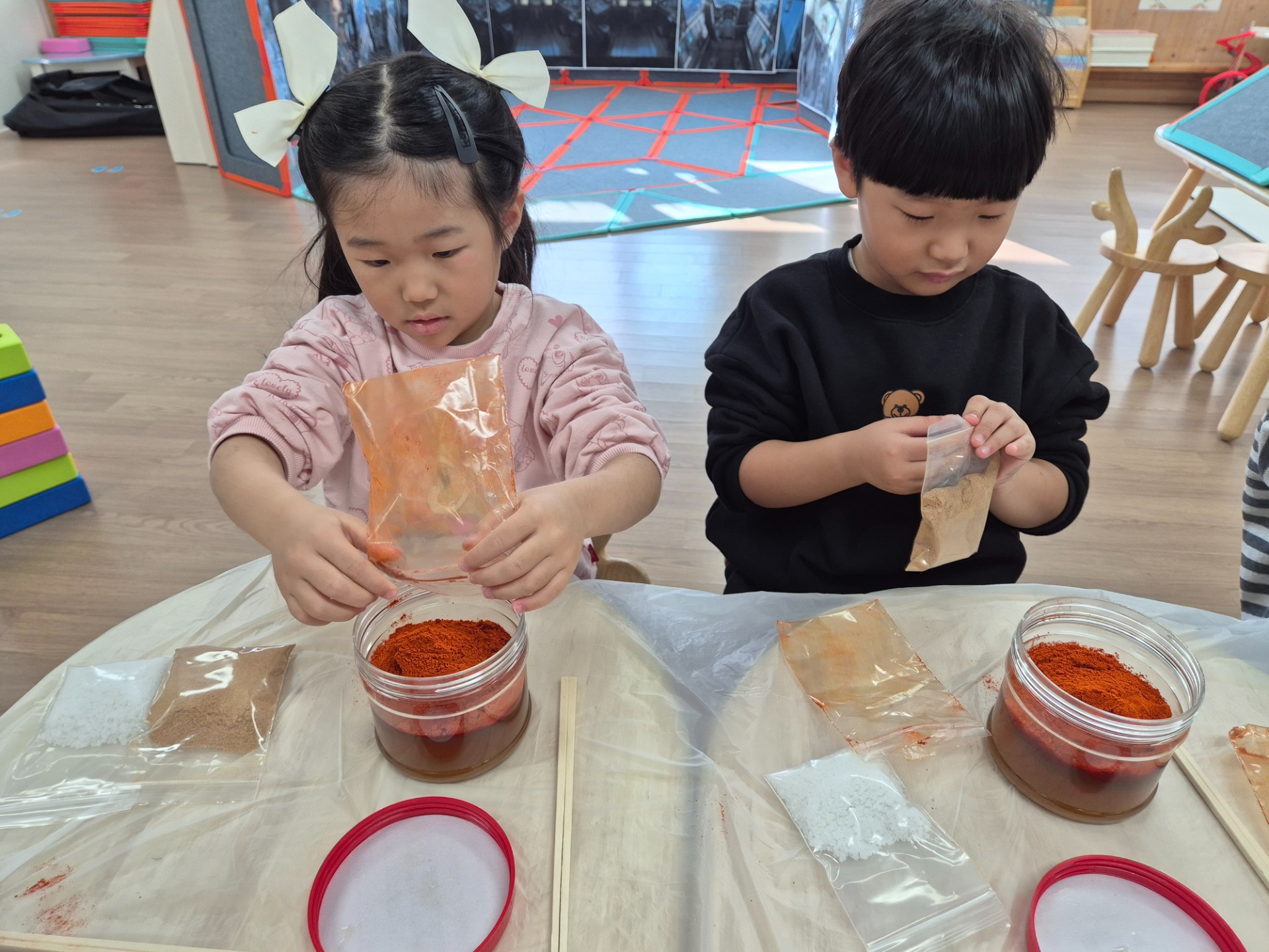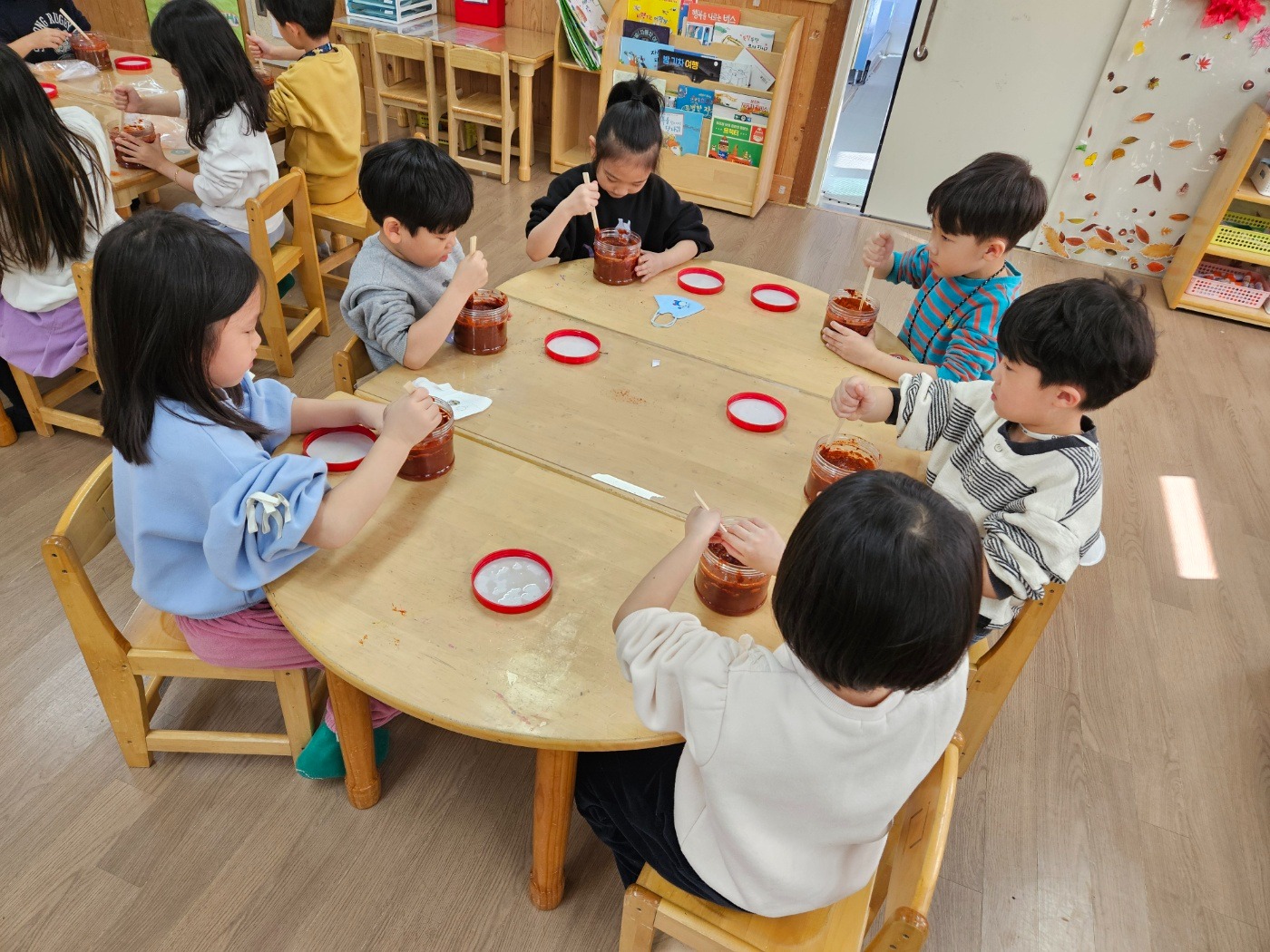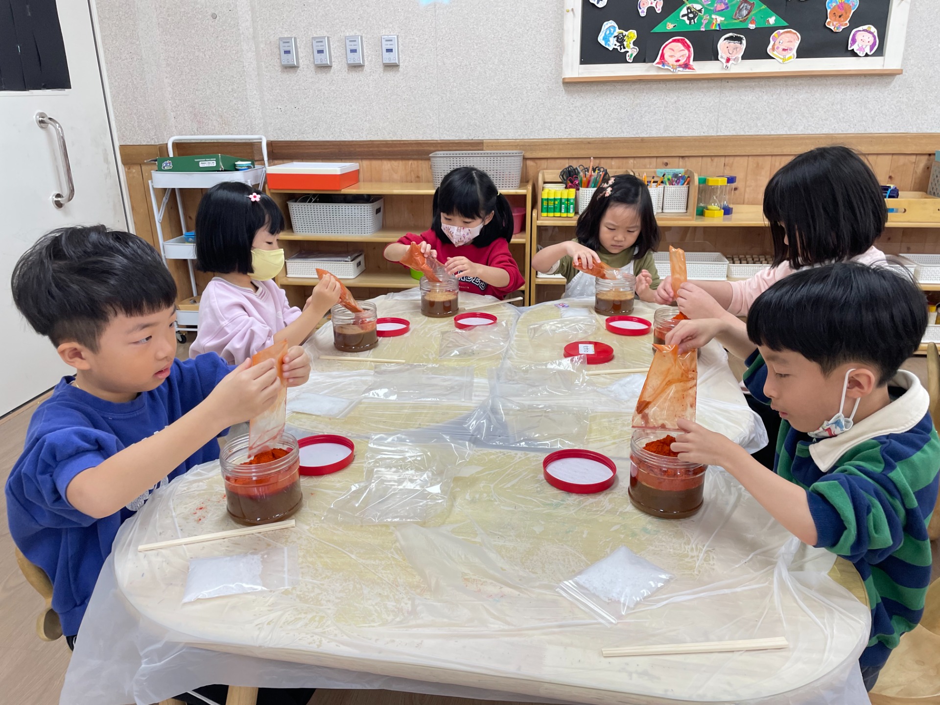 고추장 만들기 체험은 고추장 만드는 데 필요한 재료인 메줏가루, 고춧가루, 소금, 조청을 충분히 탐색해 보고 적당한 비율로 배합하여 섞어보며 진행되었다. 체험 후 유아들이 만든 고추장은 가정으로 보내어 가족들과 함께 고추장을 활용한 음식을 만들어보는 기회를 제공할 예정이다.