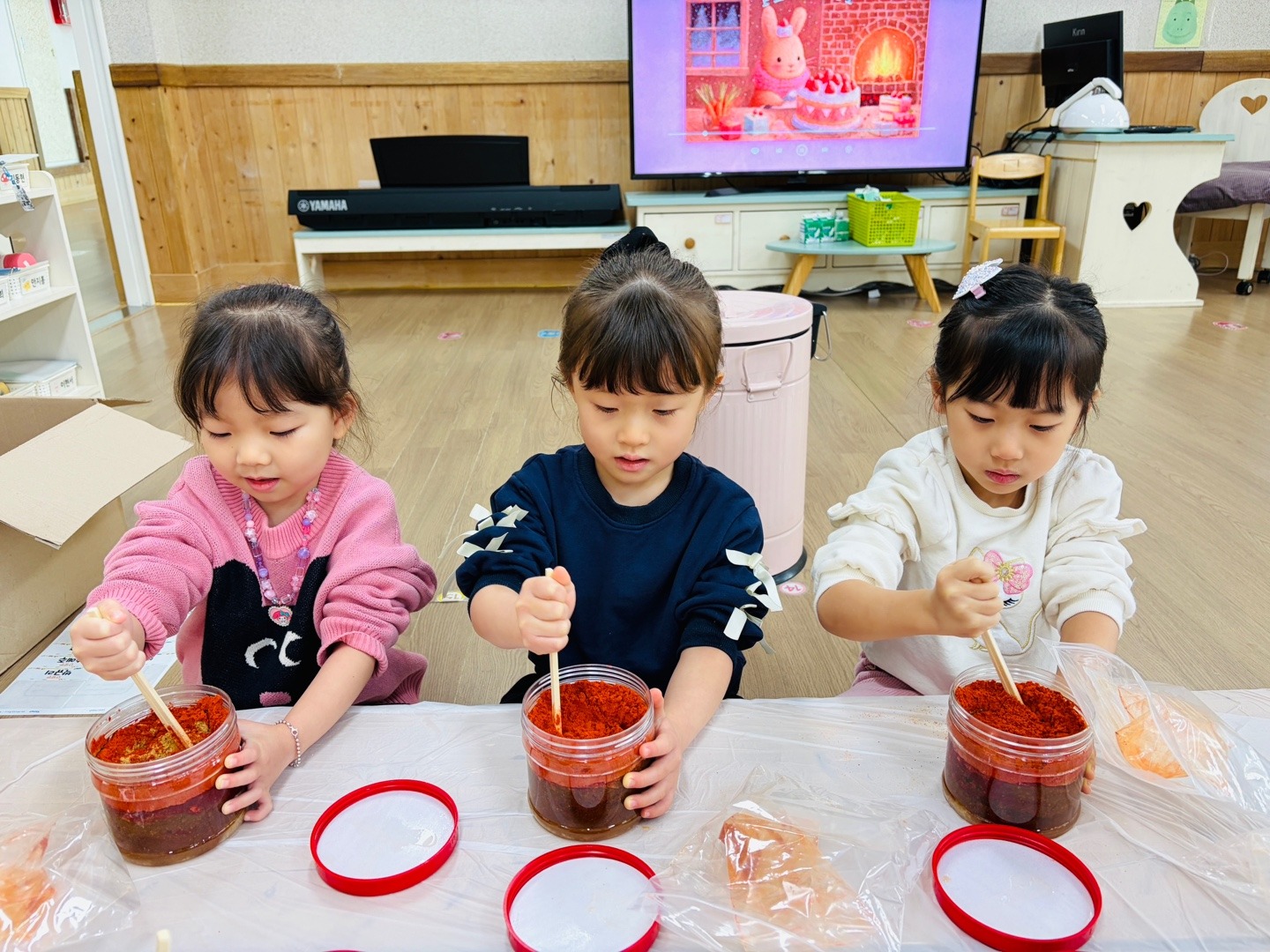 새벗유치원(원장 우수경)은 11월 28일(금) 각 교실에서 유아 122명을 대상으로 고추장 만들기 체험을 실시했다.