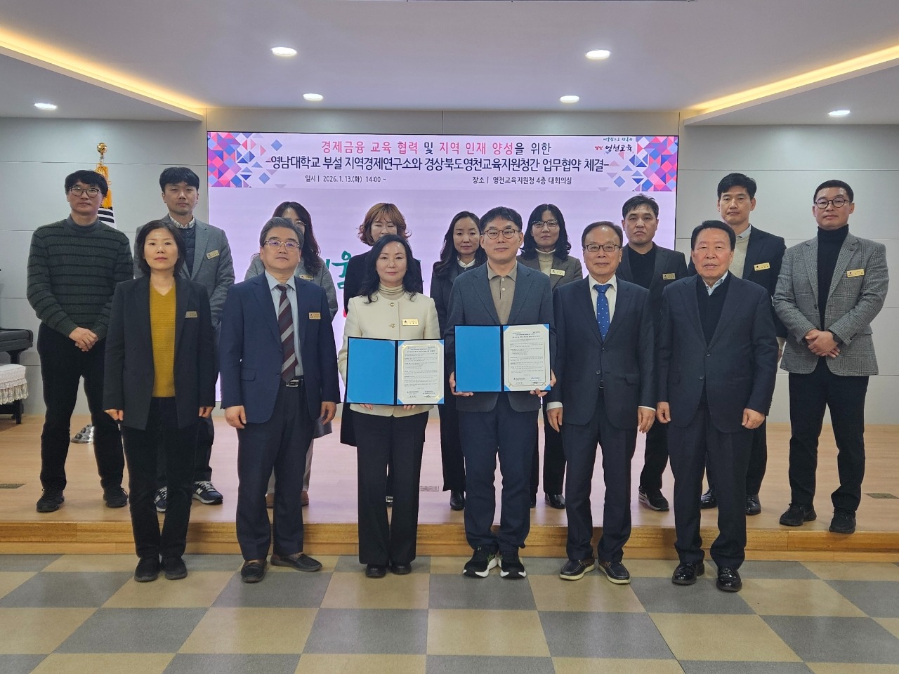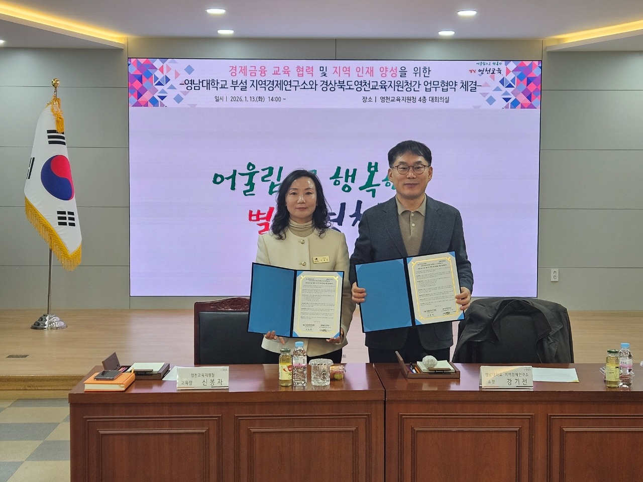 영천교육지원청(교육장 신봉자)은 1월 13일 영남대학교 부설 지역경제연구소와 지역사회 연계를 통한 경제·금융 교육 활성화를 위한 업무협약(MOU)을 체결했다.