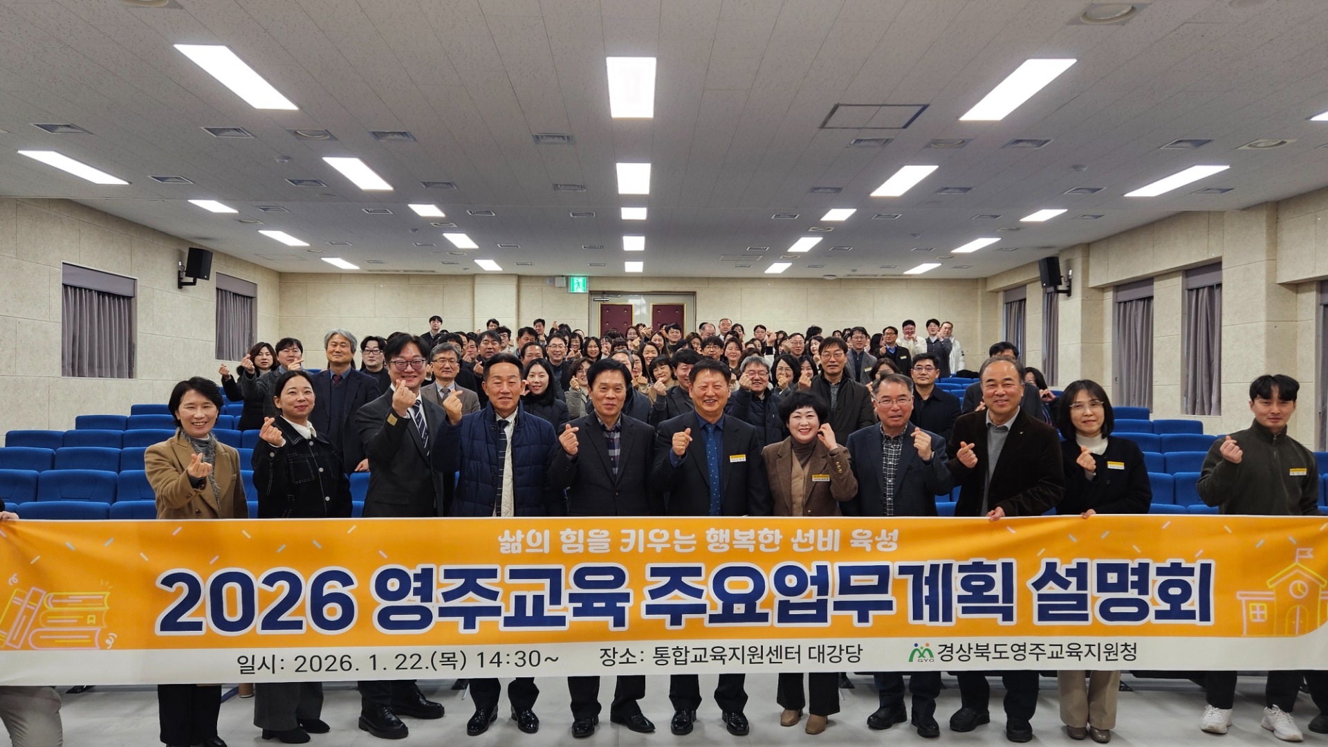 영주교육지원청(교육장 이용택)은 1월 22일(목) 영주교육지원청 대강당에서 관내 유·초·중·고 교(원)장, 학교운영위원회장, 학부모회장 등 180여 명이 참석한 가운데 「2026 영주교육 주요업무계획 설명회」를 개최했다.