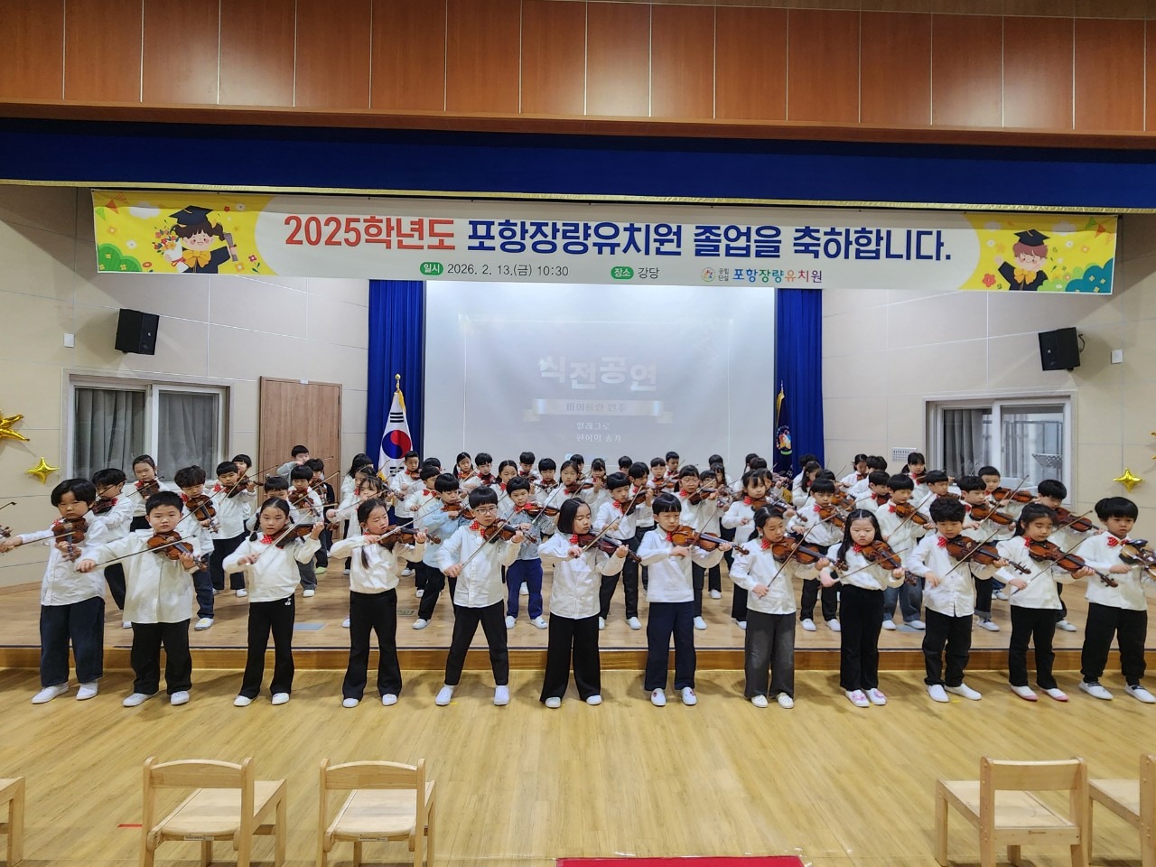 포항장량유치원(원장 이영숙)은 2월 12일(목)과 13일(금) 양일간 유치원 강당에서 ‘2025학년도 수료 및 졸업식’을 개최하였다. 수료식은 3·4세 유아를 대상으로, 졸업식은 5세 유아와 학부모가 함께한 가운데 진행되어 한 해 동안의 성장과 배움을 돌아보고 새로운 출발을 축하하는 뜻깊은 시간이 되었다.