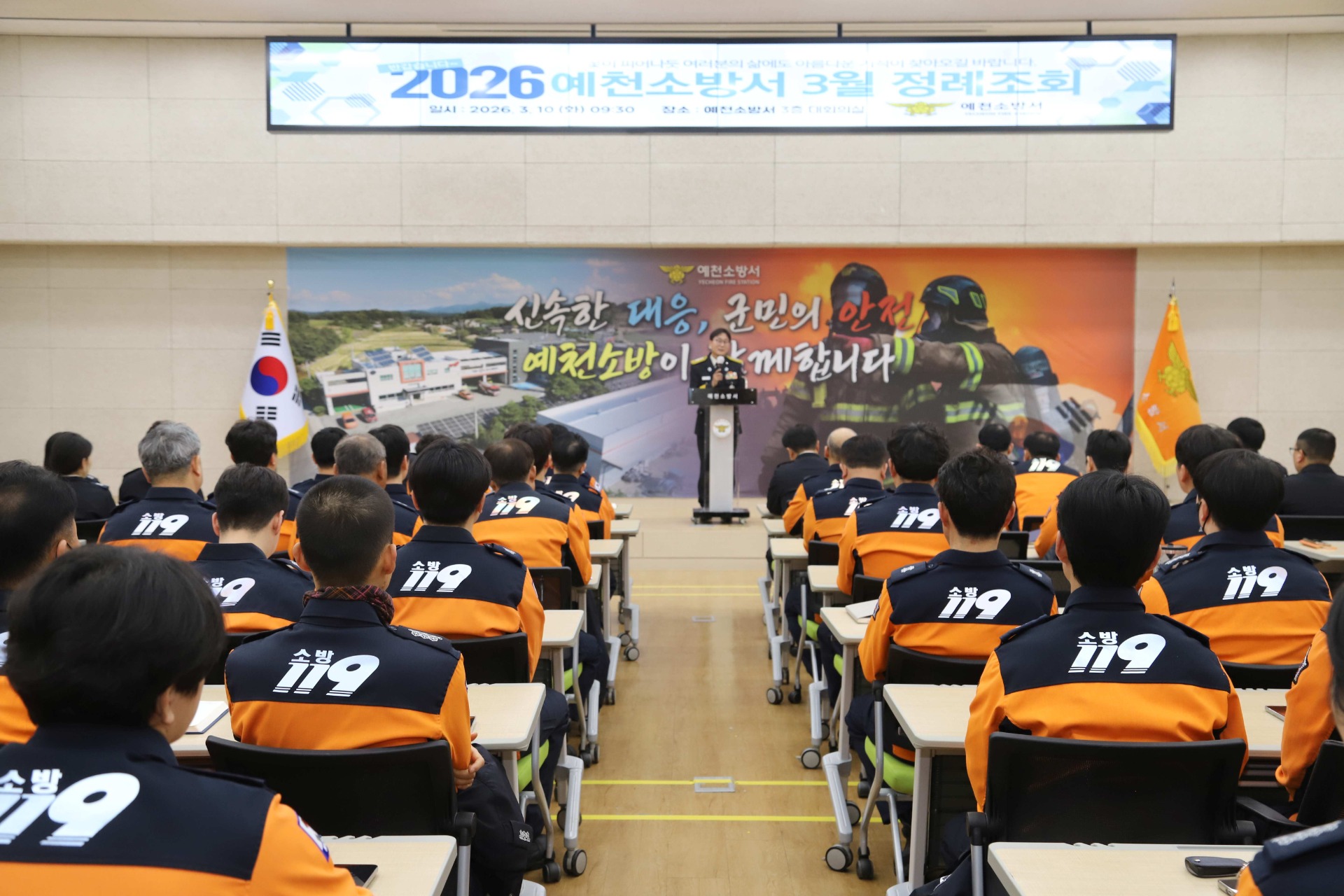 예천소방서(서장 안영호)는 10일 오전 9시 30분 소방서 3층 대회의실에서 직원 120여 명이 참석한 가운데 ‘2026년 3월 정례조회 및 직장교육’을 실시했다고 밝혔다.