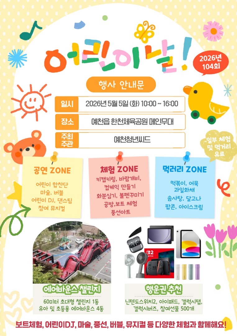 예천군 관계자는 “어린이날은 어린이가 존중받고 사랑받아야 할 소중한 날”이라며 “아이들이 마음껏 뛰놀고, 가족이 함께 웃을 수 있는 안전하고 즐거운 행사가 되도록 준비에 최선을 다하겠다”고 말했다.