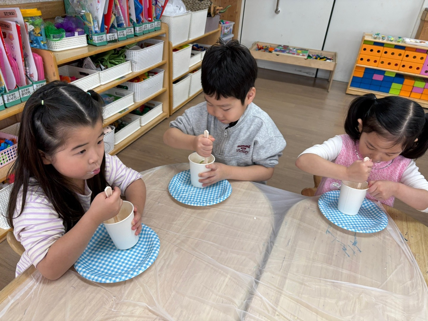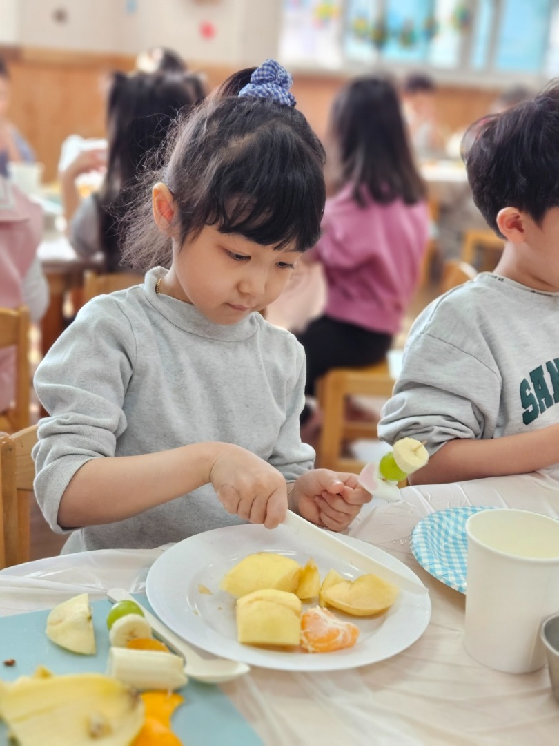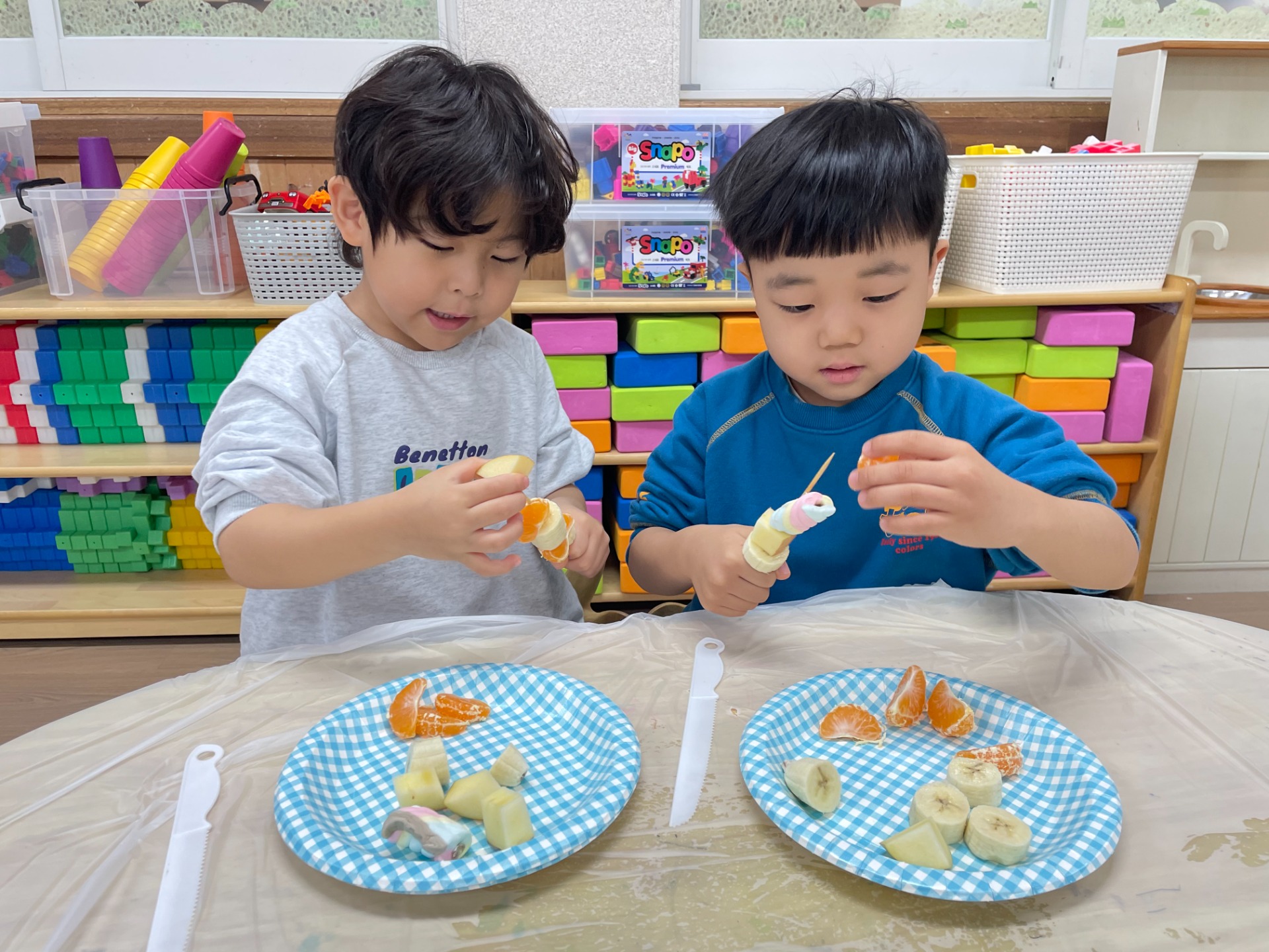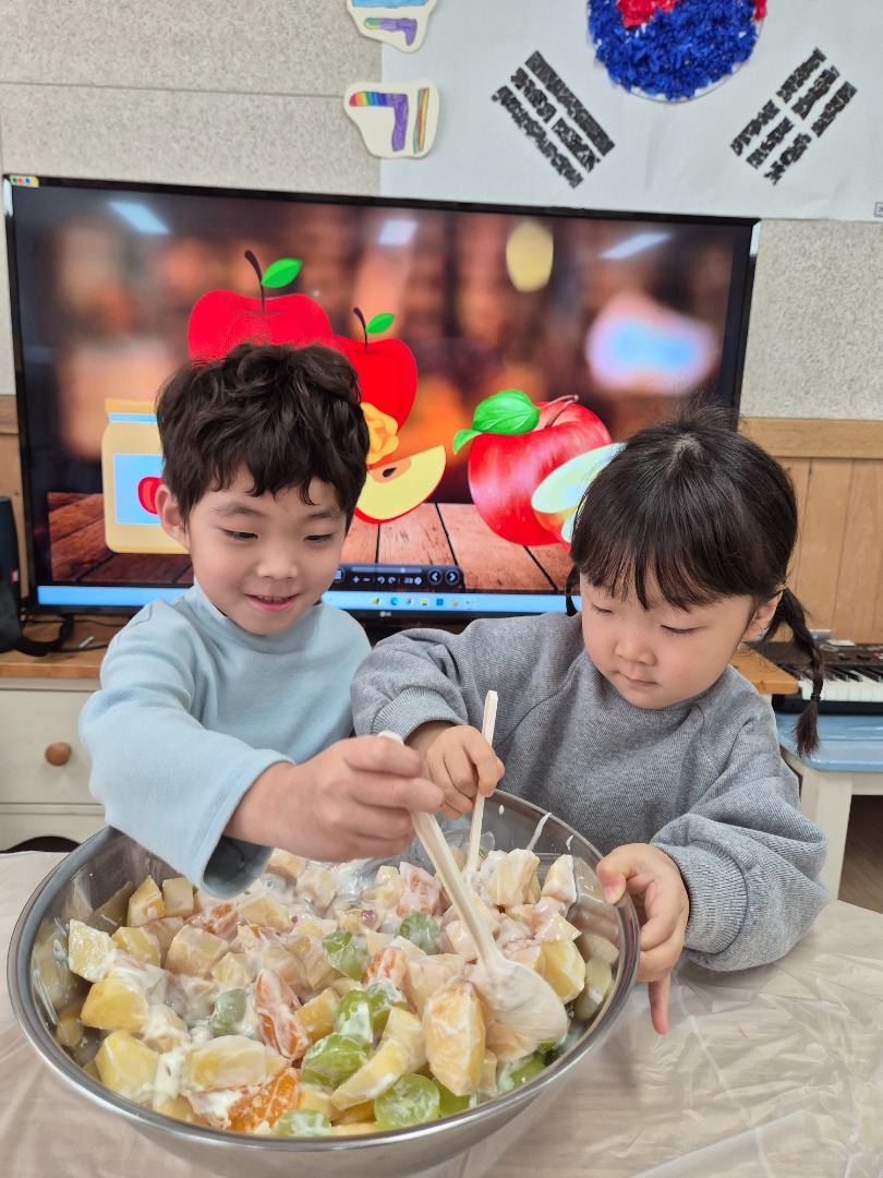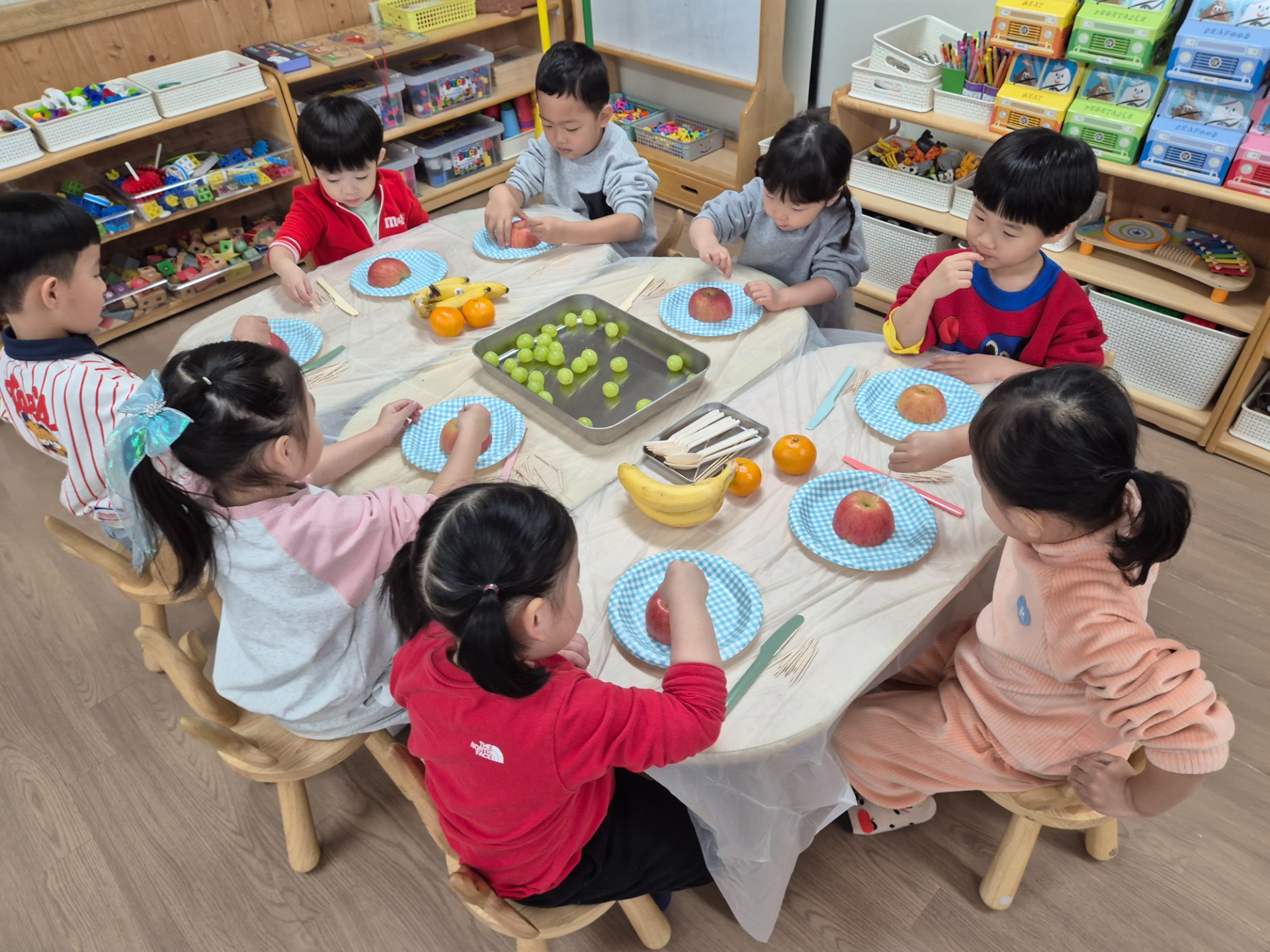사과 놀이 day가 끝나고 3세 000은 “동글동글 사과에 이쑤시개를 꽂아서 고슴도치를 만들었어요.”라고 말했고, 5세 000은 “사과 샐러드가 엄청 맛있어요! 요거트로 만드니까 달콤해서 더 맛있는 것 같아요.”라며 소감을 밝혔다.