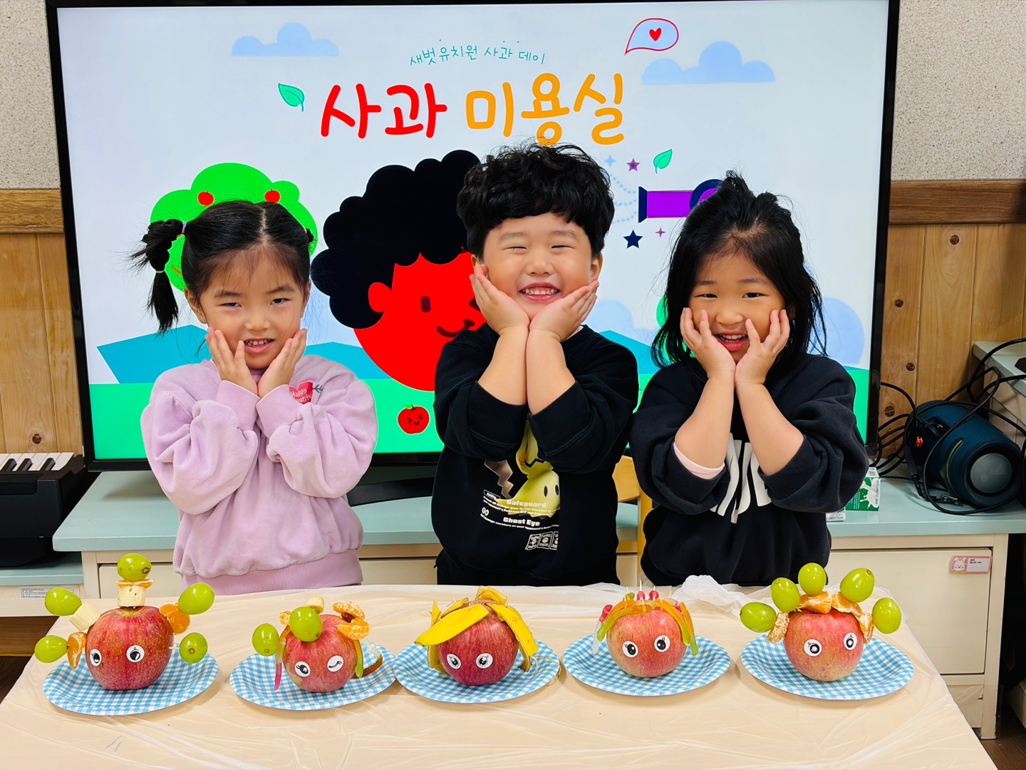 새벗유치원(원장 우수경)은 11월 27일(목) 유아 122명을 대상으로 각 학급에서 유아들의 사과를 활용해 놀이하는 ‘사과 놀이day’를 실시했다.