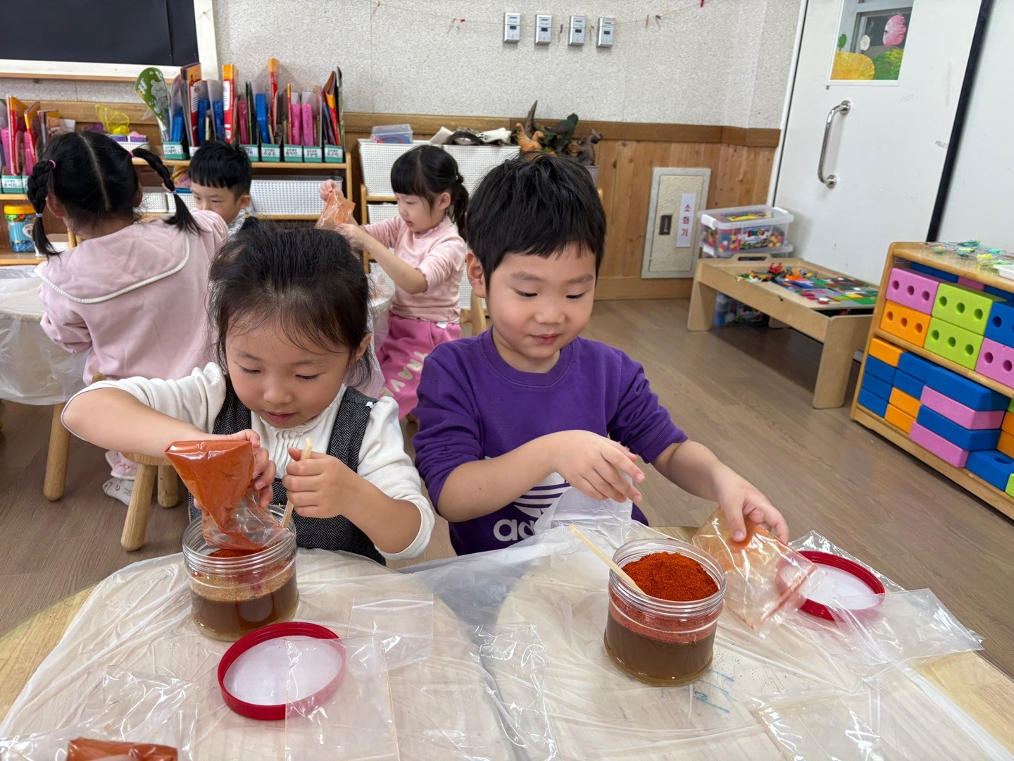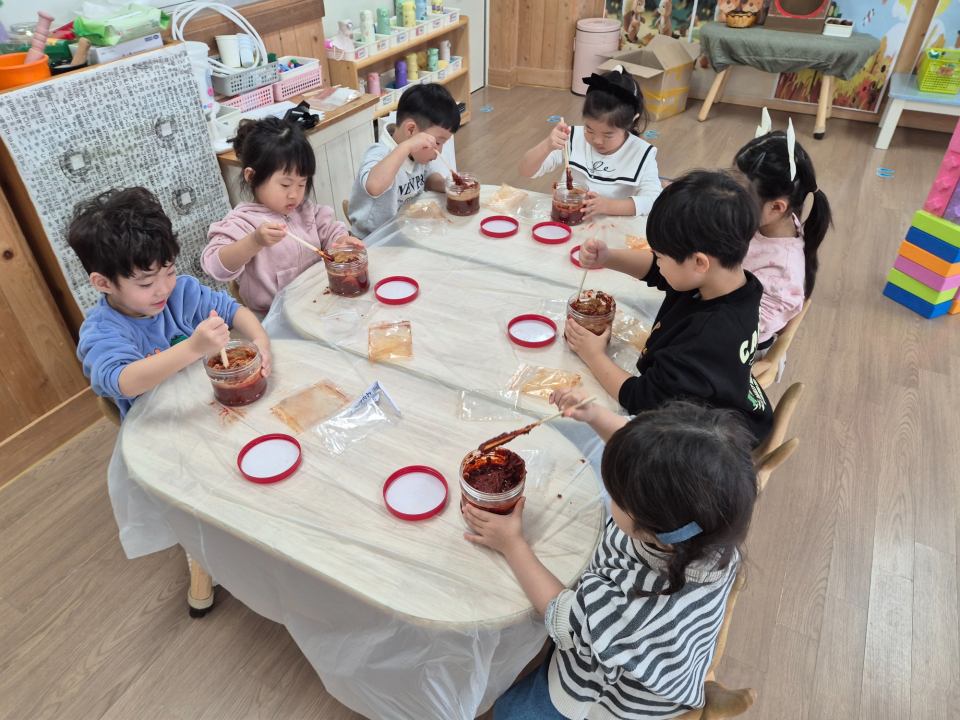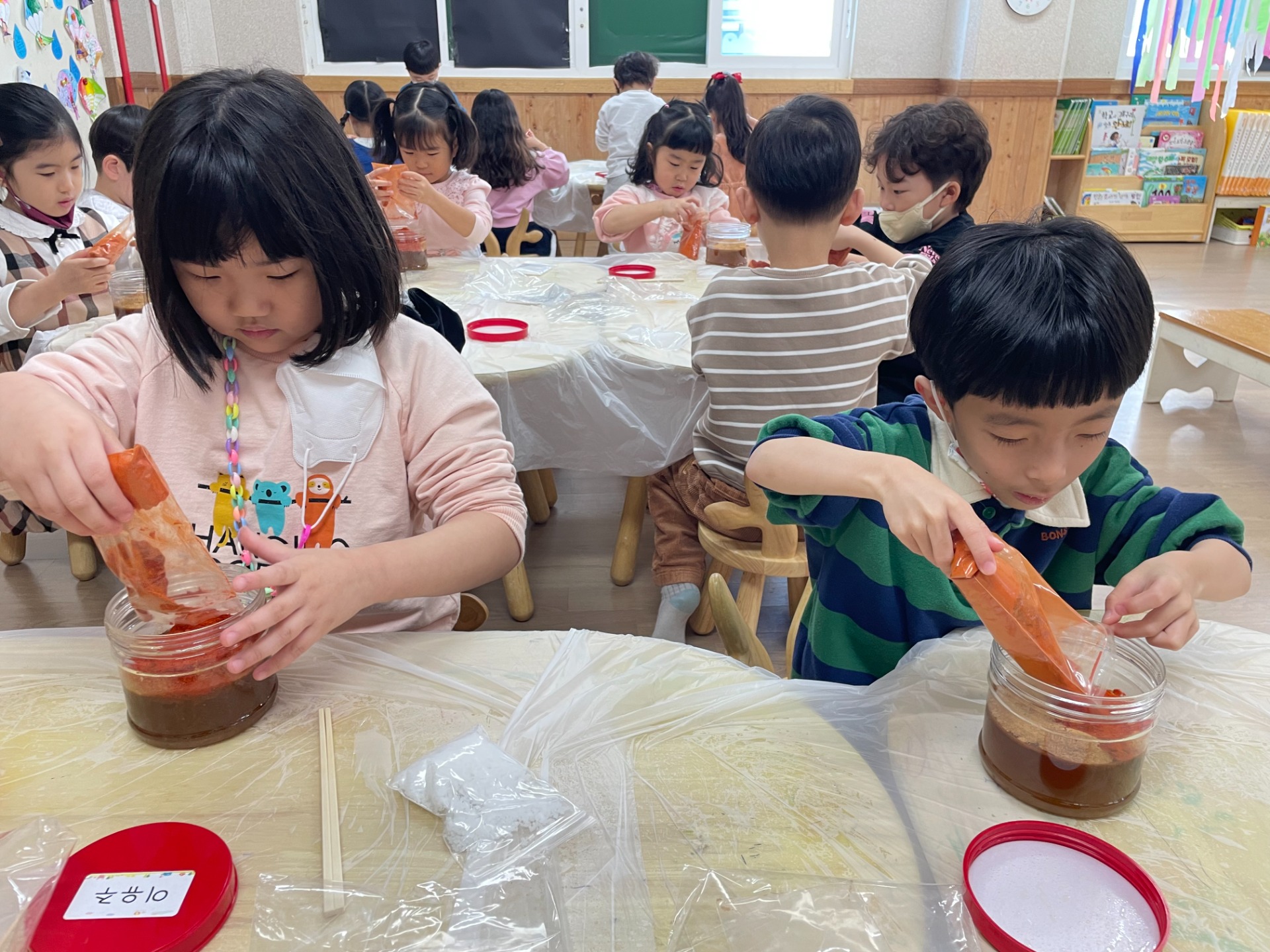 고추장 만들기 체험은 고추장 만드는 데 필요한 재료인 메줏가루, 고춧가루, 소금, 조청을 충분히 탐색해 보고 적당한 비율로 배합하여 섞어보며 진행되었다. 체험 후 유아들이 만든 고추장은 가정으로 보내어 가족들과 함께 고추장을 활용한 음식을 만들어보는 기회를 제공할 예정이다.