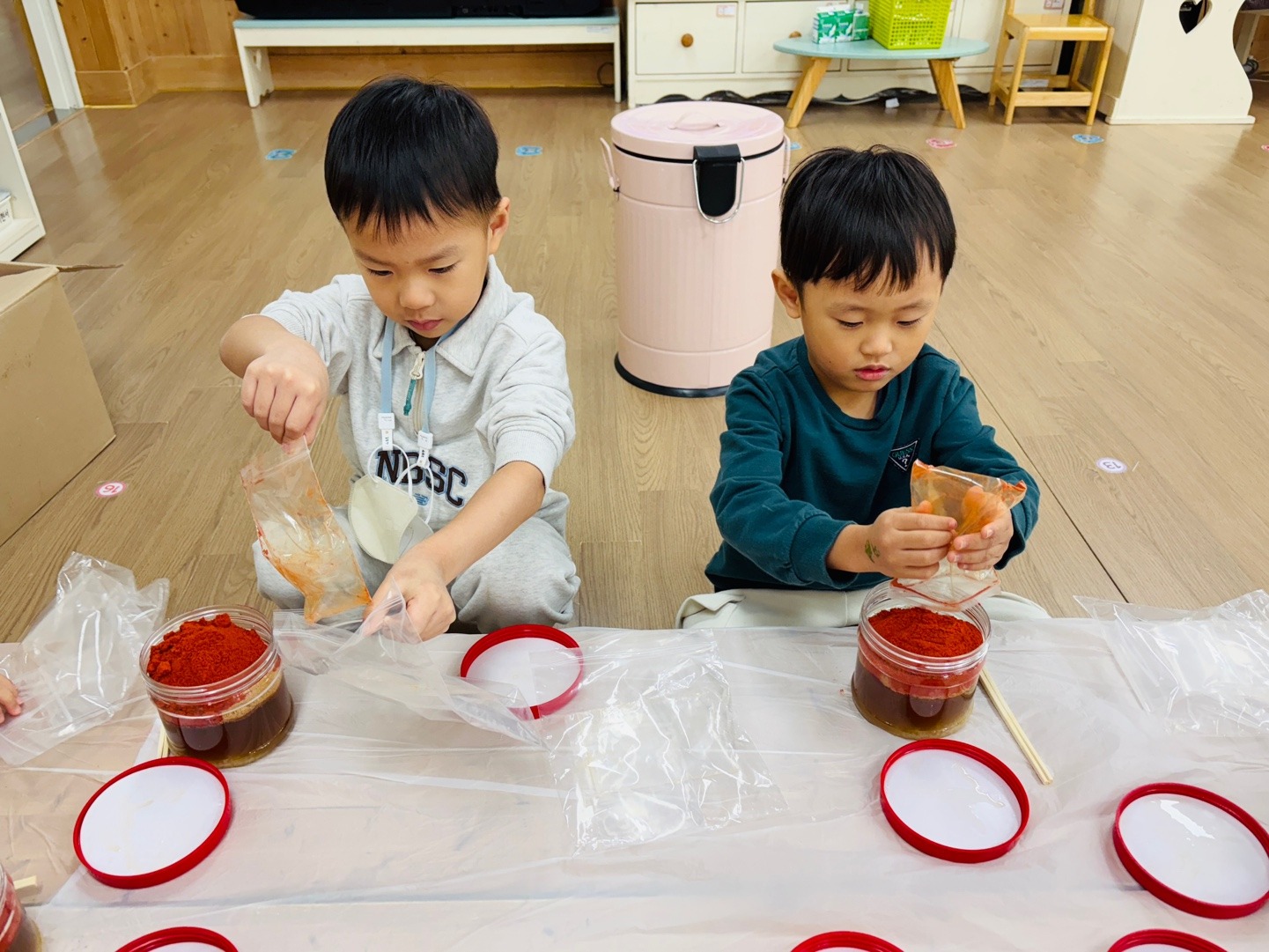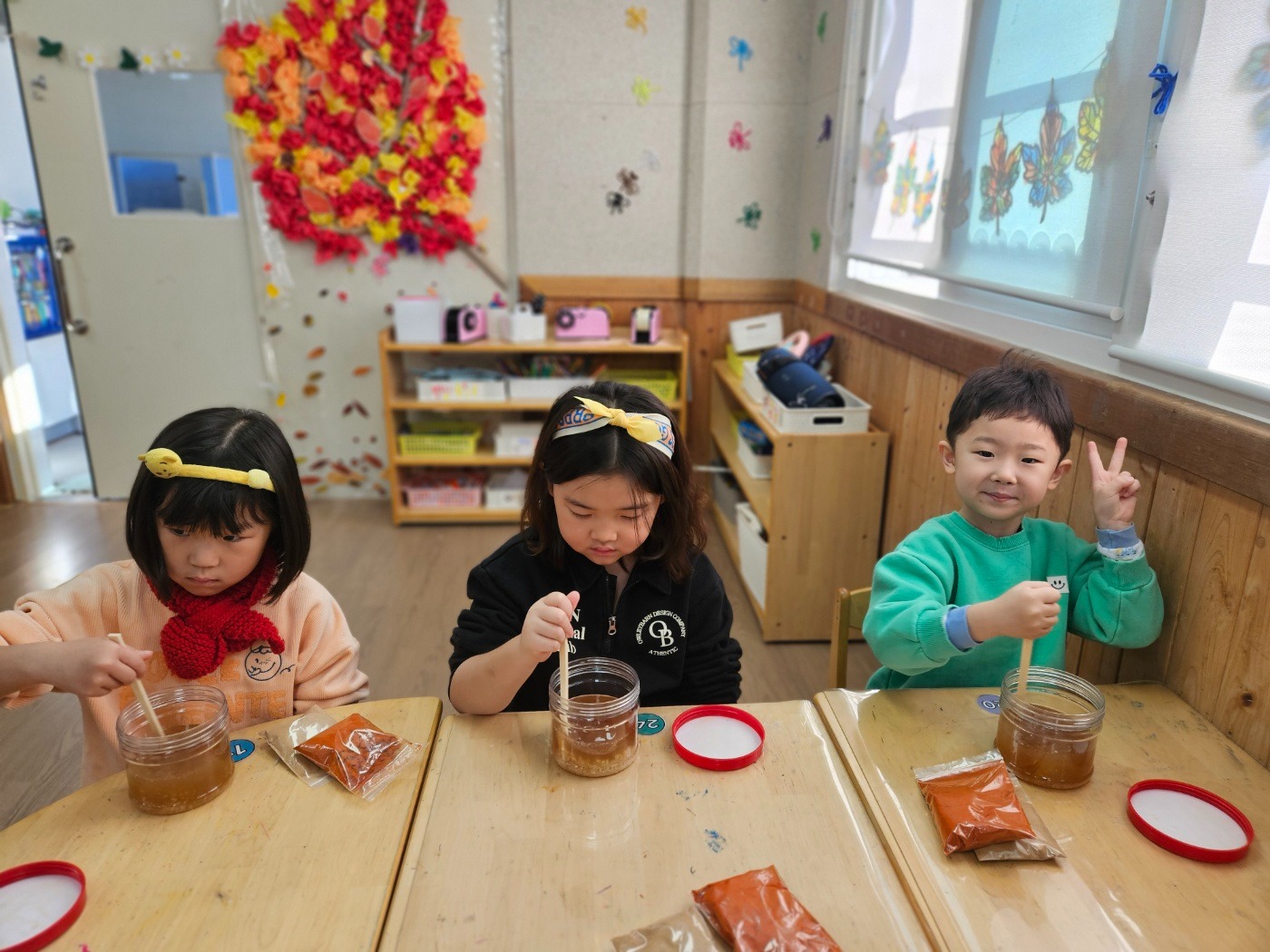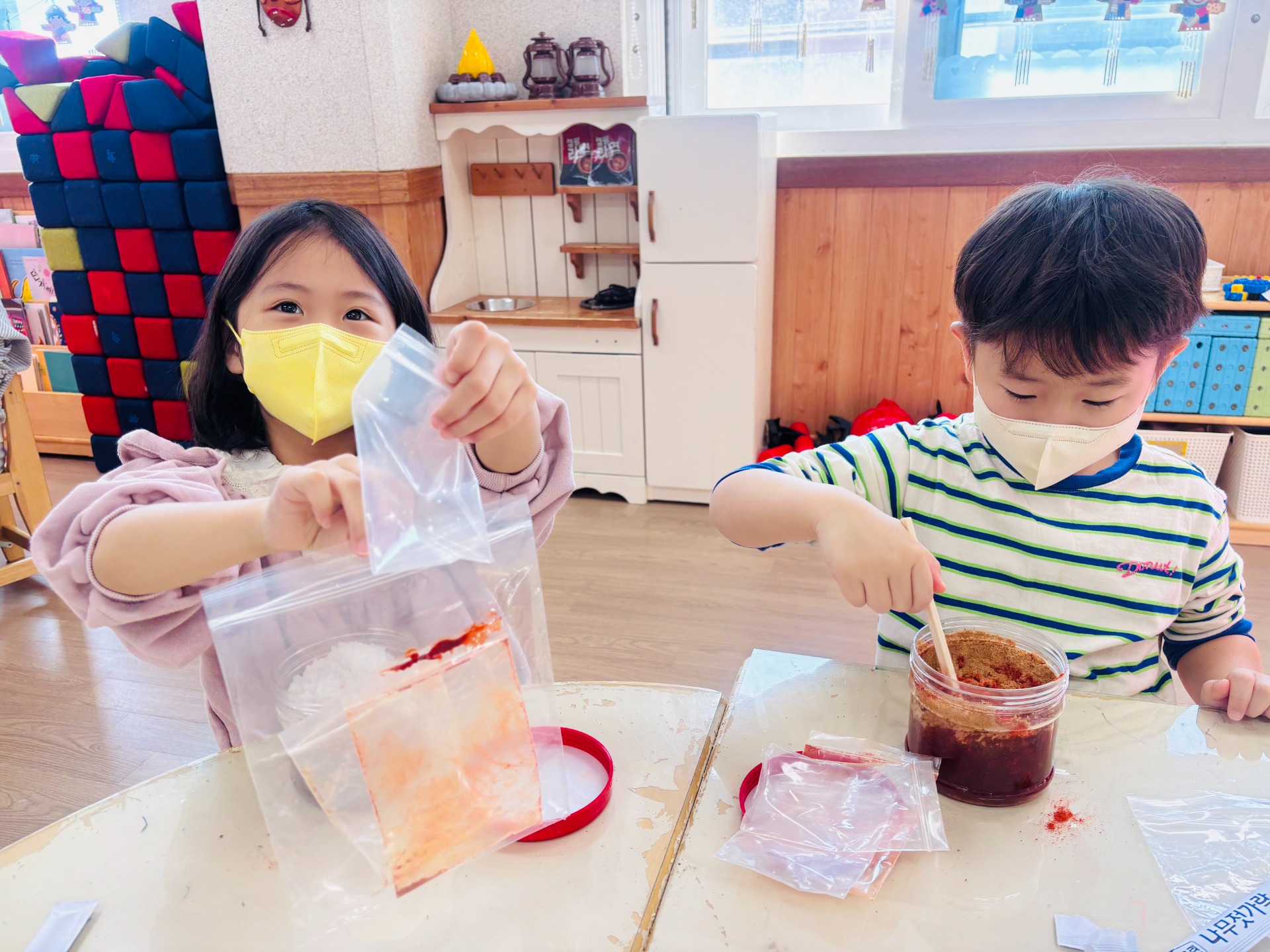고추장 만들기 체험은 고추장 만드는 데 필요한 재료인 메줏가루, 고춧가루, 소금, 조청을 충분히 탐색해 보고 적당한 비율로 배합하여 섞어보며 진행되었다. 체험 후 유아들이 만든 고추장은 가정으로 보내어 가족들과 함께 고추장을 활용한 음식을 만들어보는 기회를 제공할 예정이다.