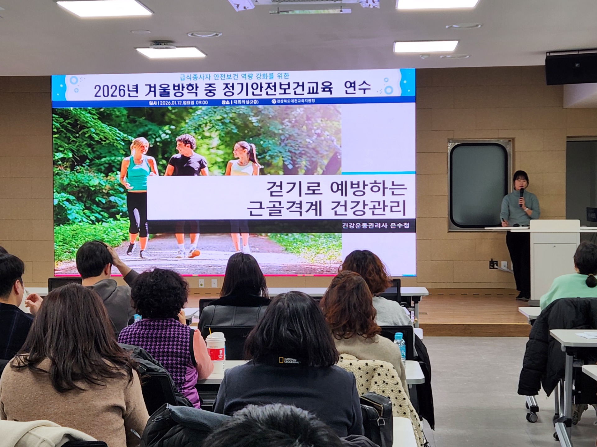 예천교육지원청(교육장 김성중)은 1월 12일(월) 경상북도예천교육지원청 2층 대회의실에서 관내 공‧사립 유‧초‧중‧고등학교 급식종사자(조리사, 조리원) 50여 명을 대상으로 겨울방학 중 정기안전보건교육을 실시했다.