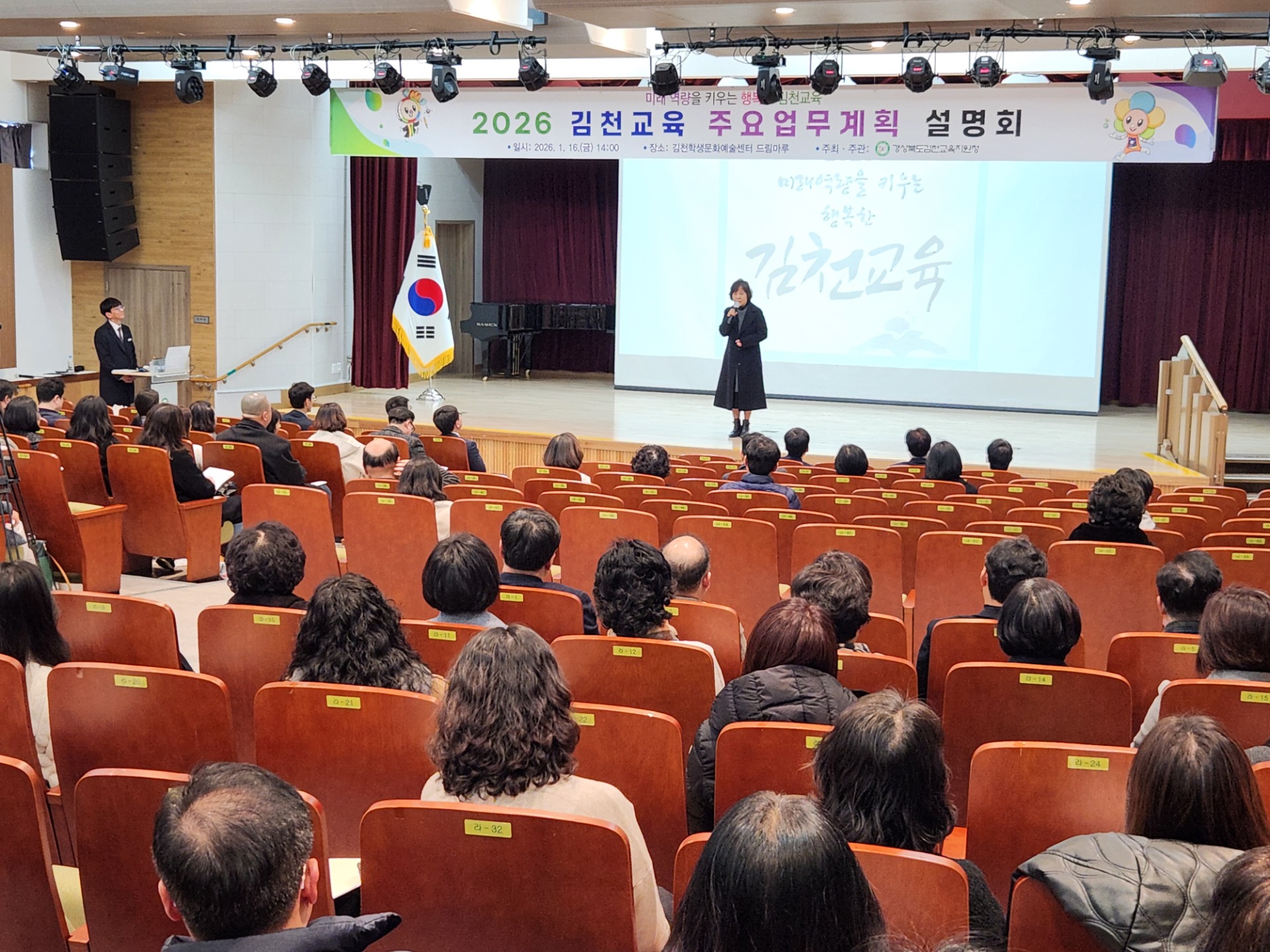김천교육지원청(교육장 모태화)은 1월 16일(금) 김천학생문화예술센터 드림마루에서 관내 유‧초‧중‧고‧각종학교 교(원)장 및 학교운영위원장, 학부모 회장 등 150여 명을 초청하여 2026 김천교육 주요업무계획 설명회를 개최하였다.