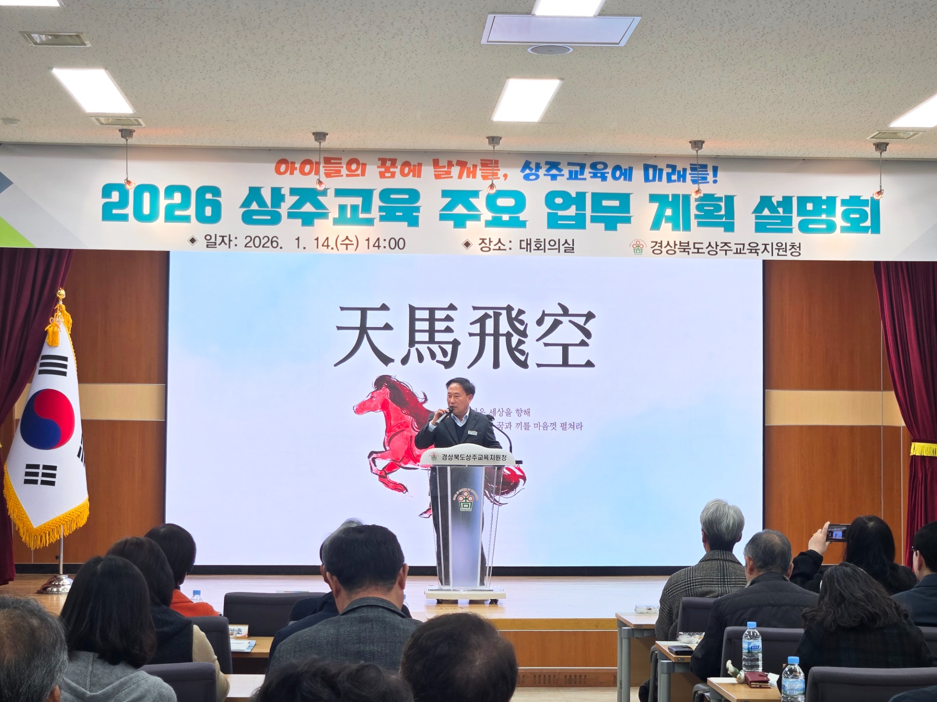 상주교육지원청(교육장 김종현)은 2026년 1월 14일(수) 대회의실에서 상주 관내 교(원)장, 학부모 단체 대표 등 80여명이 참석한 가운데 ‘2026 상주교육 주요 업무 계획 설명회’를 개최했다.