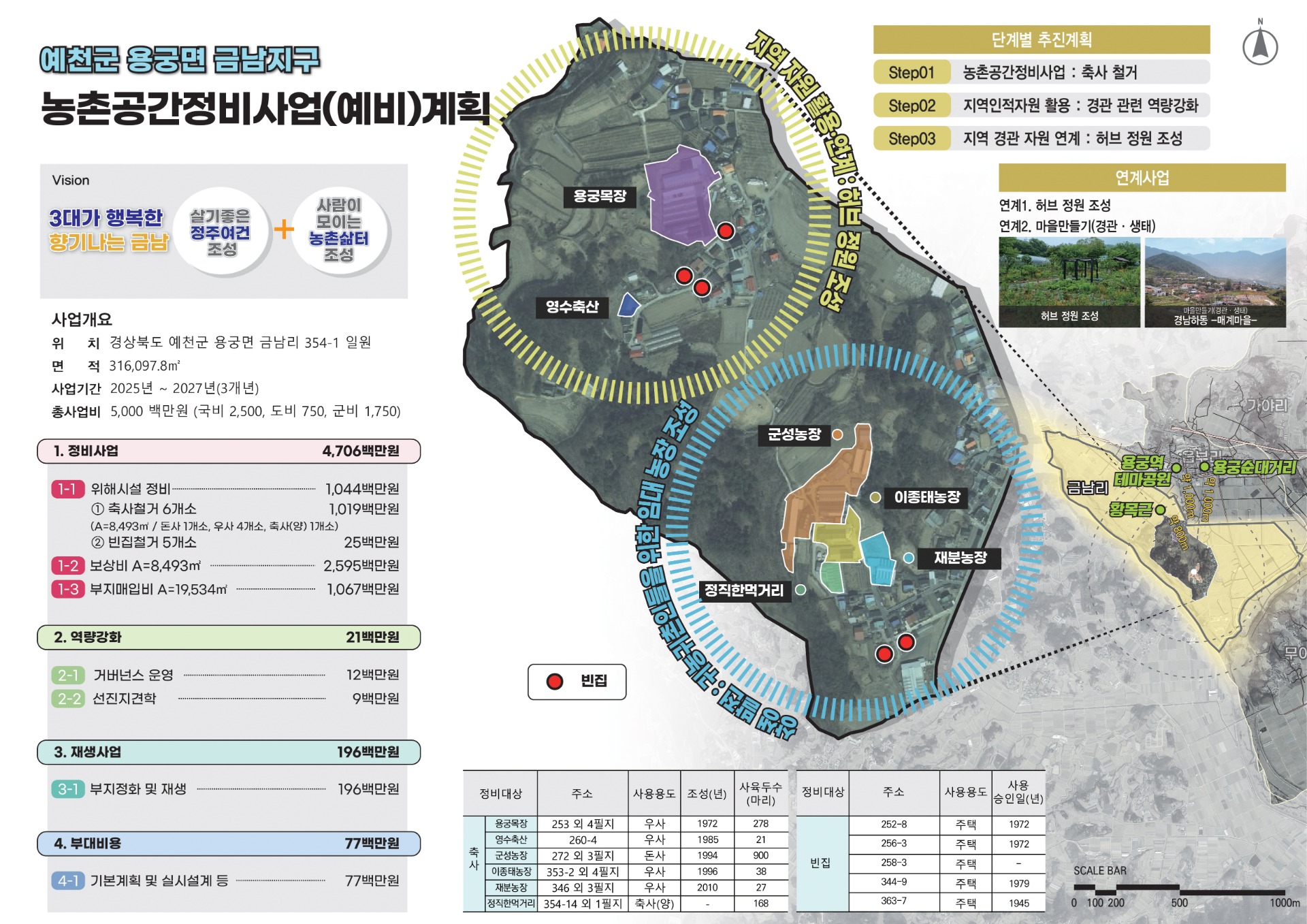 아울러 농림축산식품부 공모사업으로 선정된 ‘농촌공간 정비사업’을 통해 용문면 상금곡지구(103억 원)와 용궁면 금남지구(50억 원)의 유해시설을 정비한다. 이를 통해 주민 숙원이던 악취 문제를 해소하고, 안전하고 쾌적한 농촌 정주환경을 조성할 계획이다.