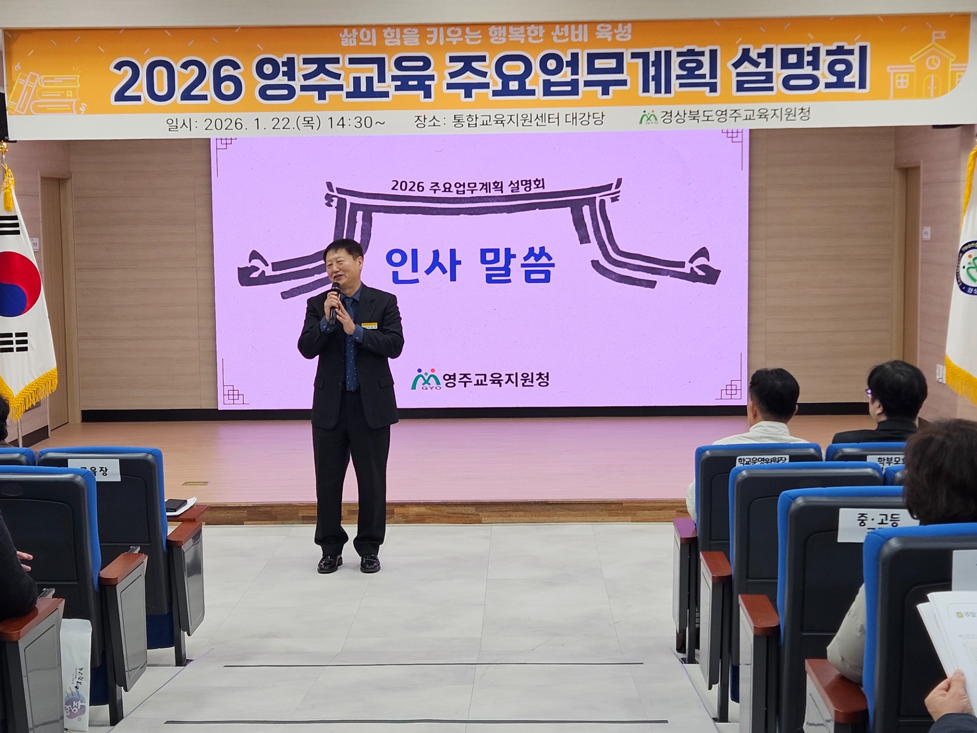 영주교육지원청(교육장 이용택)은 1월 22일(목) 영주교육지원청 대강당에서 관내 유·초·중·고 교(원)장, 학교운영위원회장, 학부모회장 등 180여 명이 참석한 가운데 「2026 영주교육 주요업무계획 설명회」를 개최했다.