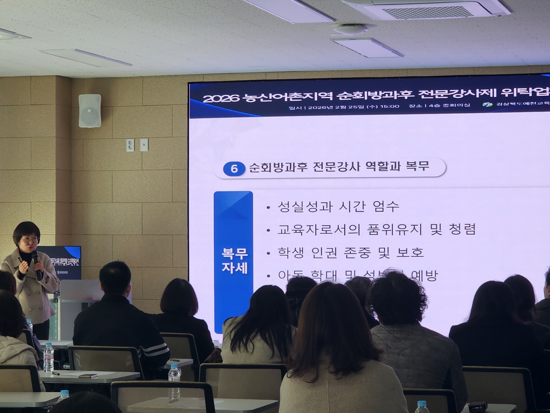 예천교육지원청(교육장 김성중)은 2월 25일(목) 예천교육지원청 중회의실에서 방과후 강사 및 위탁업체 관계자 30여 명을 대상으로 2026학년도 농산어촌 순회방과후 전문강사제 프로그램 운영을 위한 위탁 업체 오리엔테이션을 실시했다.