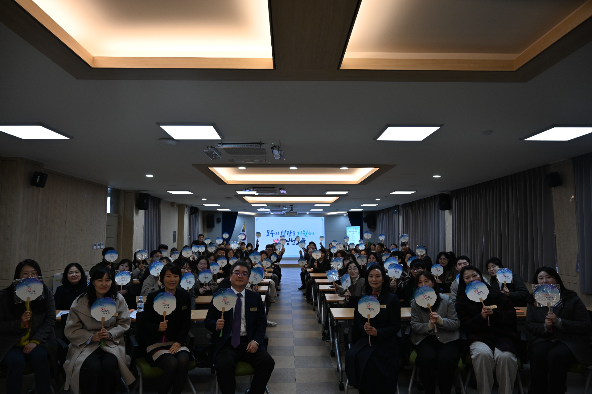 설명회 이후에는 「2026 영천교육계획」기념 부채를 들고 전 직원이 함께 단체 기념사진을 촬영하였다. 직원들은 부채에 담긴 영천교육의 비전 문구를 함께 펼쳐 보이며 ‘모두의 성장을 지원하는 별빛 영천교육’의 실천 의지를 다졌다. 이번 기념촬영은 2026 영천교육계획의 현장 안착과 공동 실천 의지를 상징적으로 보여주는 뜻깊은 시간이 되었다.