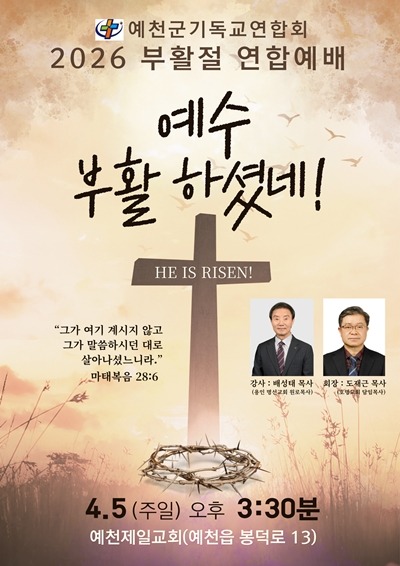 [채석일 기자]예천군기독교연합회(회장 도재근 목사.호명교회)는 오는 4월5일 부활절을 맞아 ‘2026년 부활절 연합예배’를 개최한다.