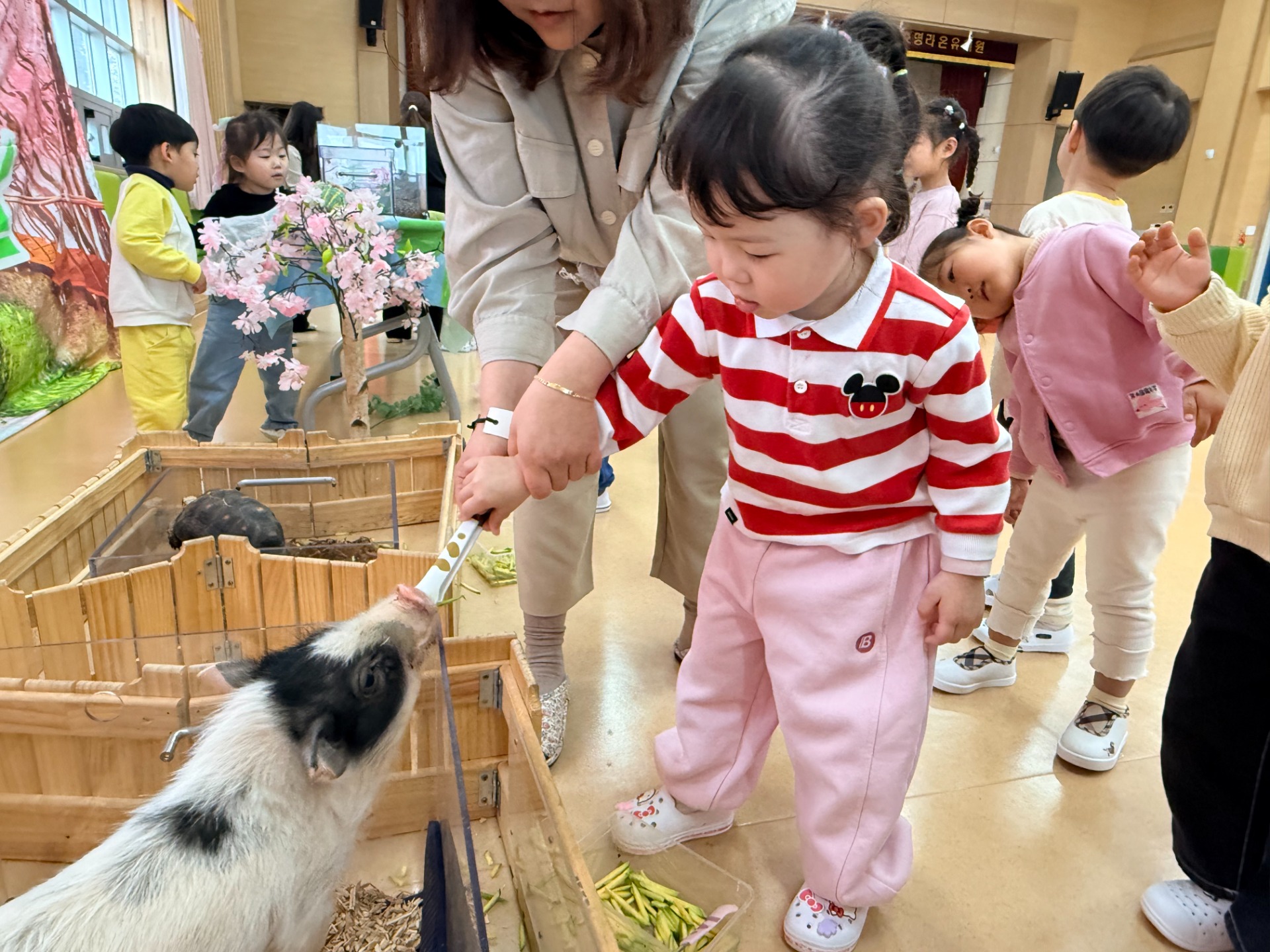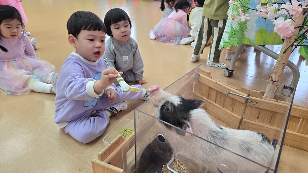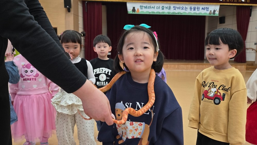 유아들은 미니피그, 롭이어토끼, 육지거북, 가고일게코, 골든햄스터, 버미즈, 실키닭, 팬서 카멜레온, 콘스네이크, 썬코뉴어 등을 차례로 만나며 생김새, 움직임, 먹이, 서식 환경 등 동물별 특성을 비교해 보았다. 또한 동물을 만질 때는 갑작스러운 행동을 삼가고, 동물이 불안해하지 않도록 눈높이를 맞추어 천천히 다가가는 등 배려하는 태도를 실천하며 교감 활동에 참여하였다. 활동 중에는 손 씻기와 손 소독 등 위생 수칙을 철저히 지키며 질서 있게 체험을 마무리하였다.